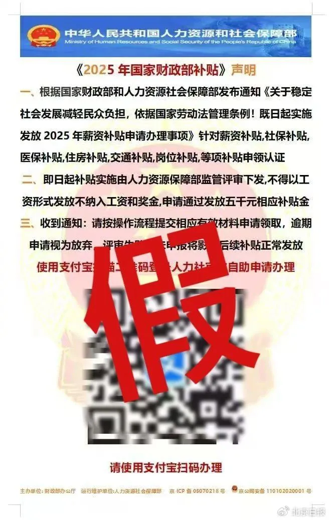 人力资源社会保障部从未发放过所谓的“薪资补贴”或“2025年国家财政补贴”。上述通知为不实信息且涉嫌诈骗,牢记“三不要”不要信!不要点!不要转!捂紧自己的钱袋子。