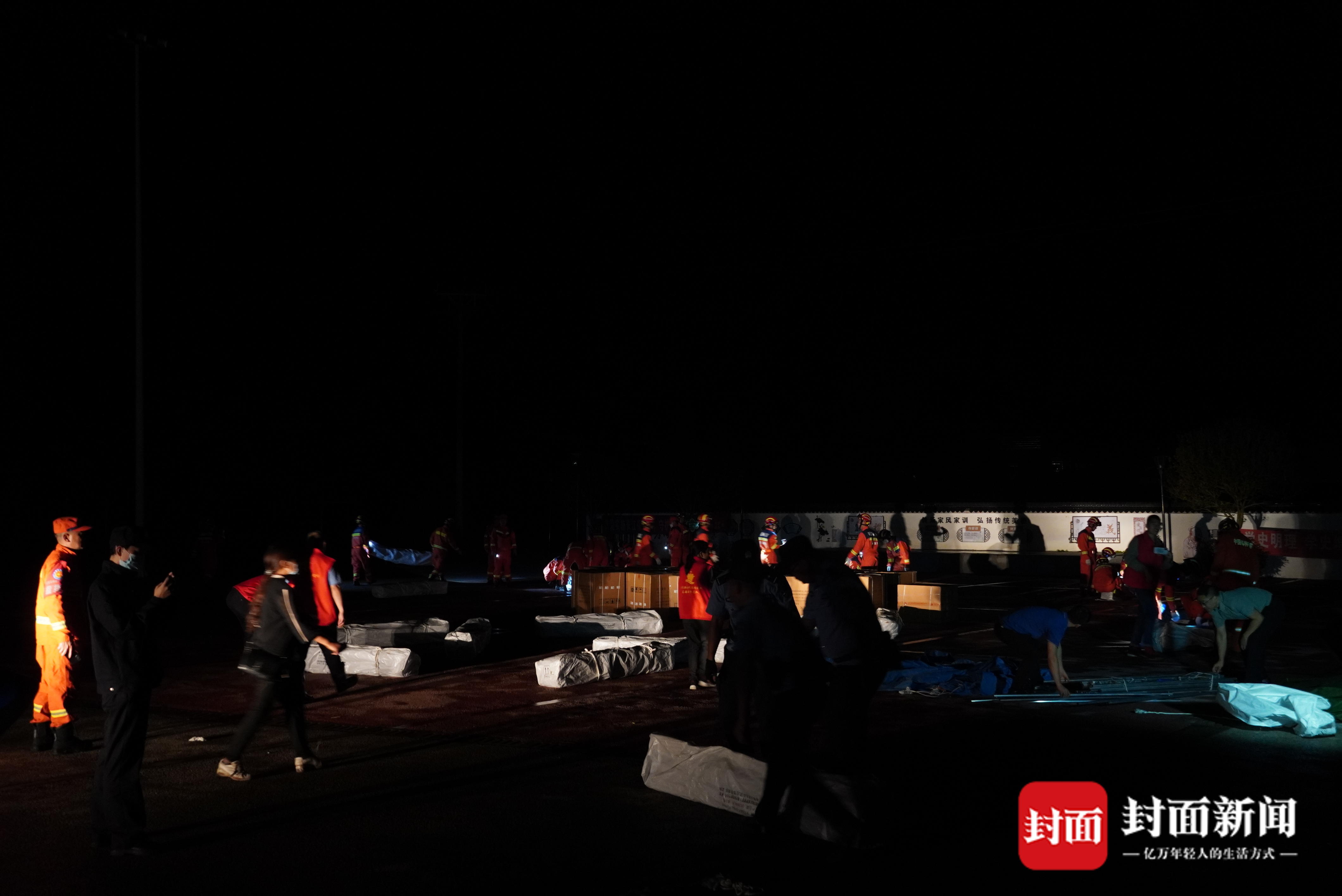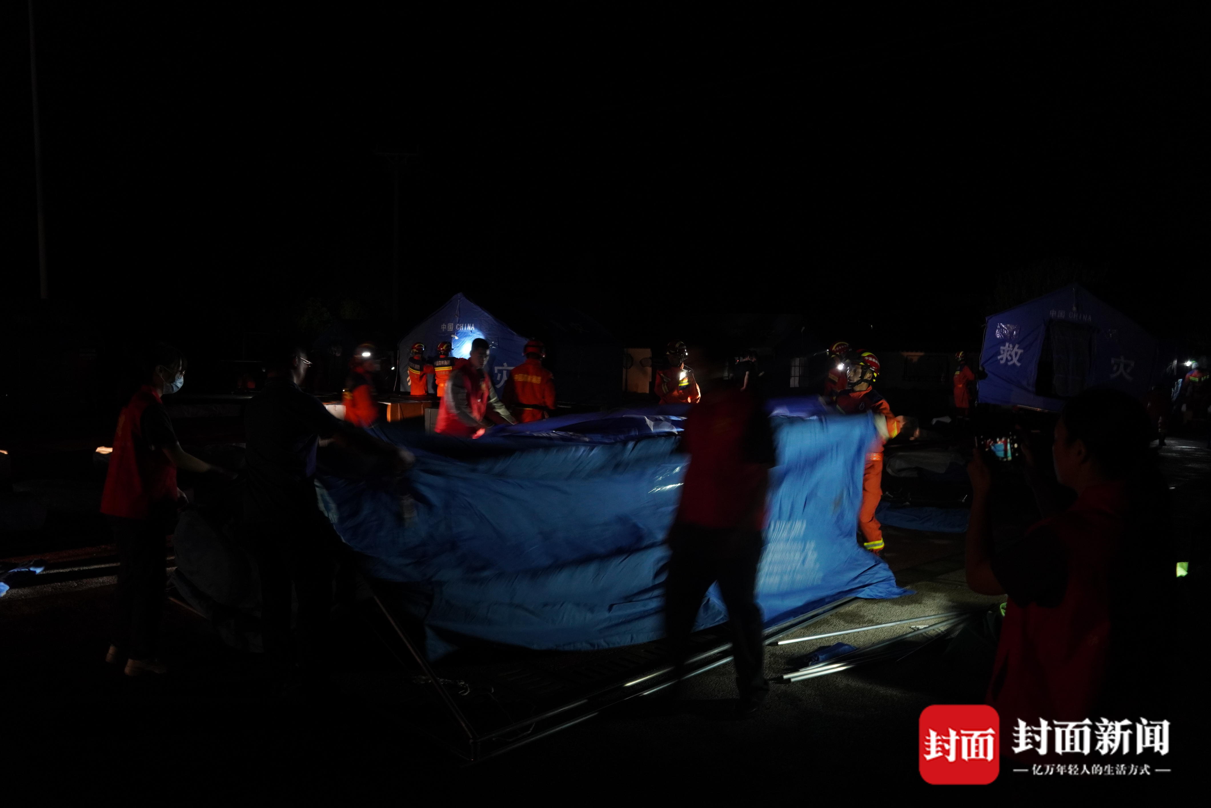 “十一点了,大家加把油,速度再快一点,还有不少群众等着住进帐篷呢,十二点之前,我们要将这个安置点的帐篷和物资准备到位。”现场的群众都纷纷动起手来给指战员们帮忙,有帮忙打手电筒的,有一起搭床的,现场一派齐心协力,共度难关的景象。就在帐篷快搭建完毕的时候,新的情况出现了。