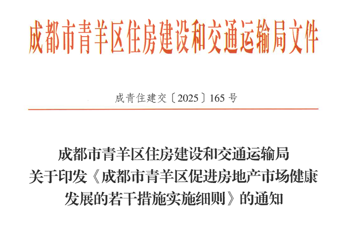 11月4日,成都市青羊区住房建设和交通运输局官网发布两则关于促进房地产市场健康发展的通知,明确六大支持方向,包含购房就学、车位去化、团体购房等直接惠及购房者的措施,政策实施期为2025年12月3日至2026年12月31日。据悉,这是成都“新政17条”出台后,成都主城区第二个公布购房补贴政策的区域。