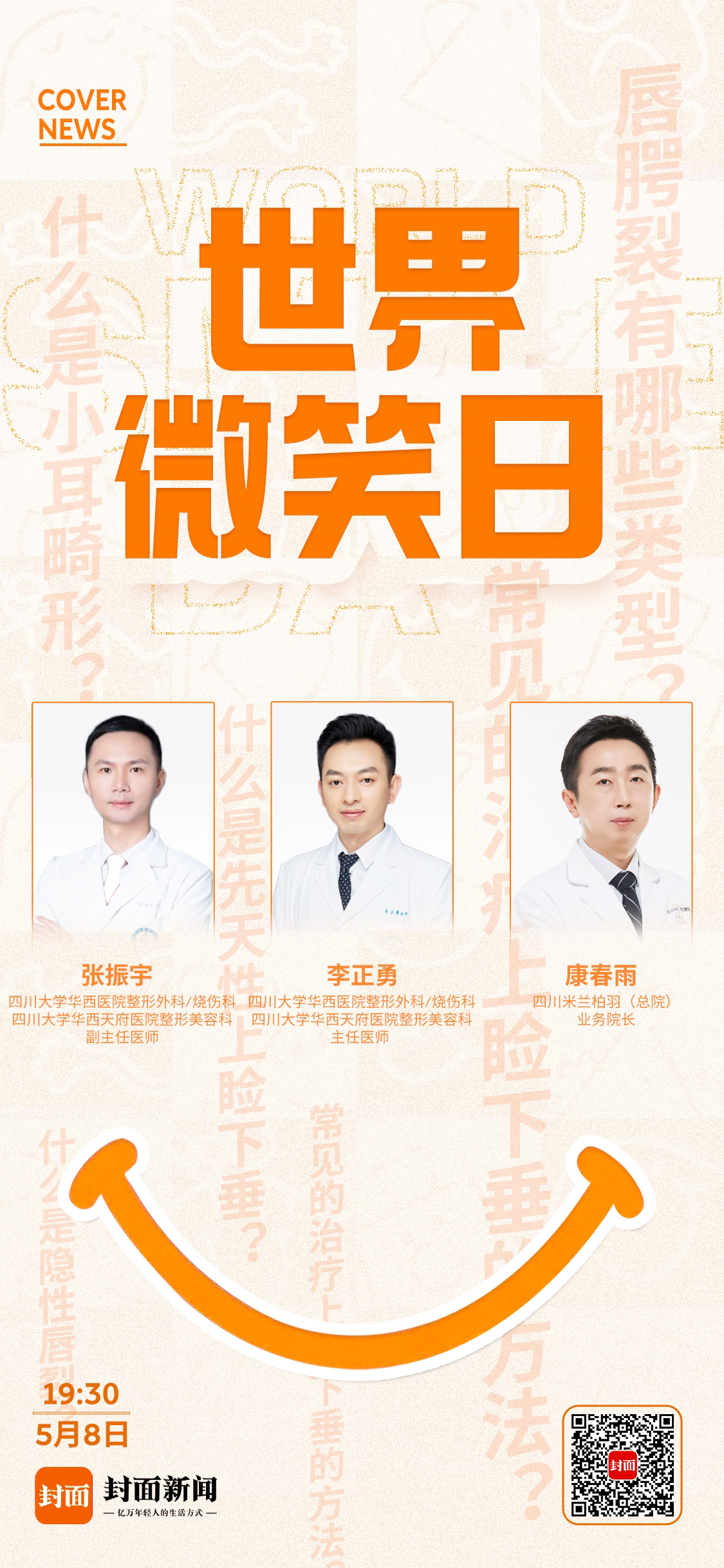 5月8日,是一个专属“微笑”的日子 -- “世界微笑日”!我们邀请到 四川大学华西医院整形外科/烧伤科主任医师李正勇、四川大学华西医院整形外科/烧伤科 四川大学华西天府医院整形美容科 副主任医师张振宇、四川米兰柏羽(总院)业务院长康春雨为孩子们的微笑助力。