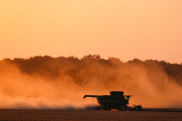 美国印第安纳州沃伦市的一个农场正在收割大豆。(《华盛顿邮报》报道截图)