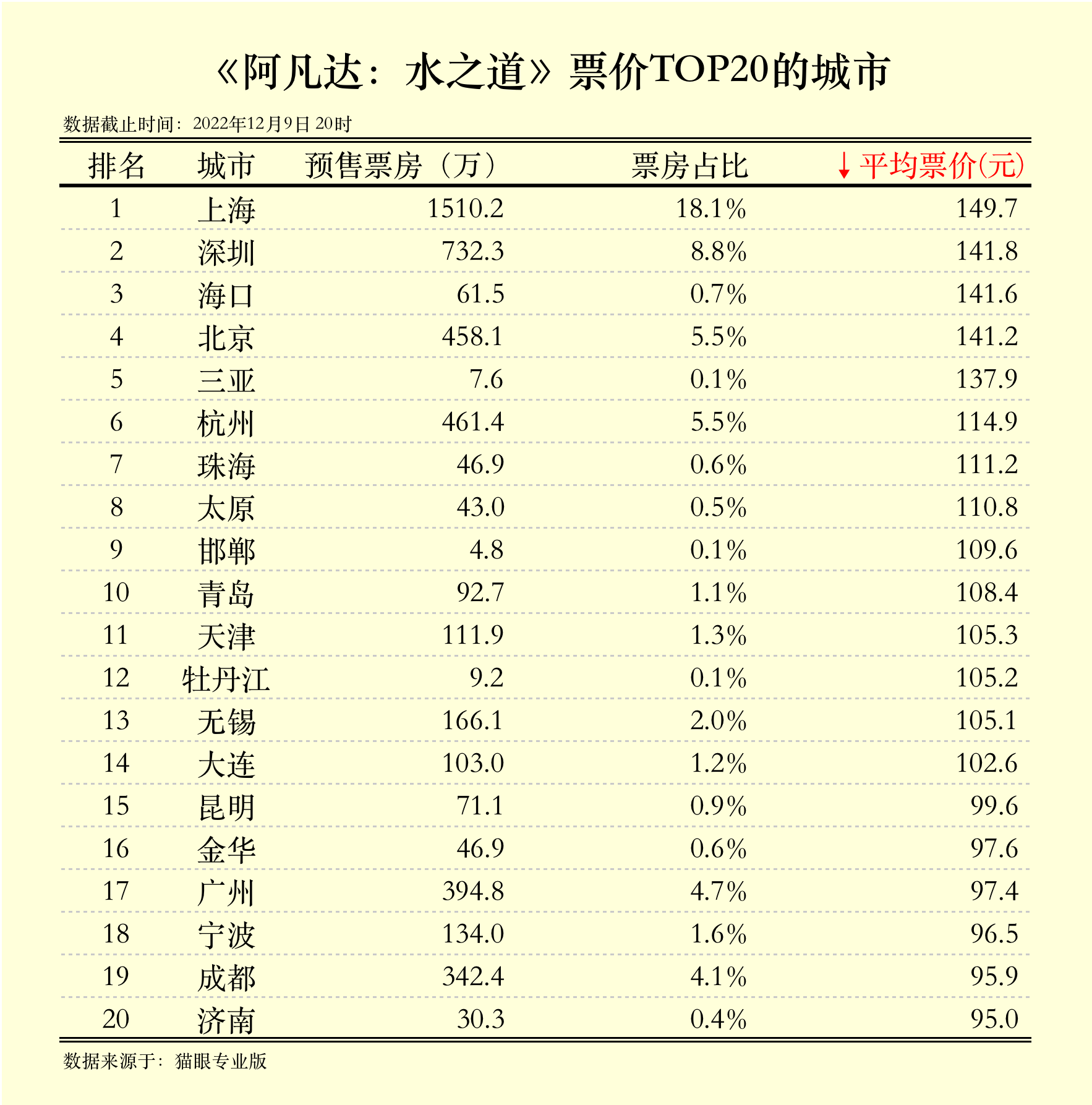 封面新闻记者了解到,《阿凡达2》全国预售平均票价为91.5元。其中,上海、深圳、海口的票价位居全国前三。上海市预售票房为1510万,占全国预售票房的18%,平均票价达149.7元。作为西南影市重镇的成都,该片预售票房342万,平均票价95元,位居全国城市《阿凡达2》票价top20排名第19。一位院线经理告诉记者,作为一部耗资十多年拍摄的3d科幻大片,且影片时长达到3小时10分钟,《阿凡达2》的高票价在情理之中。