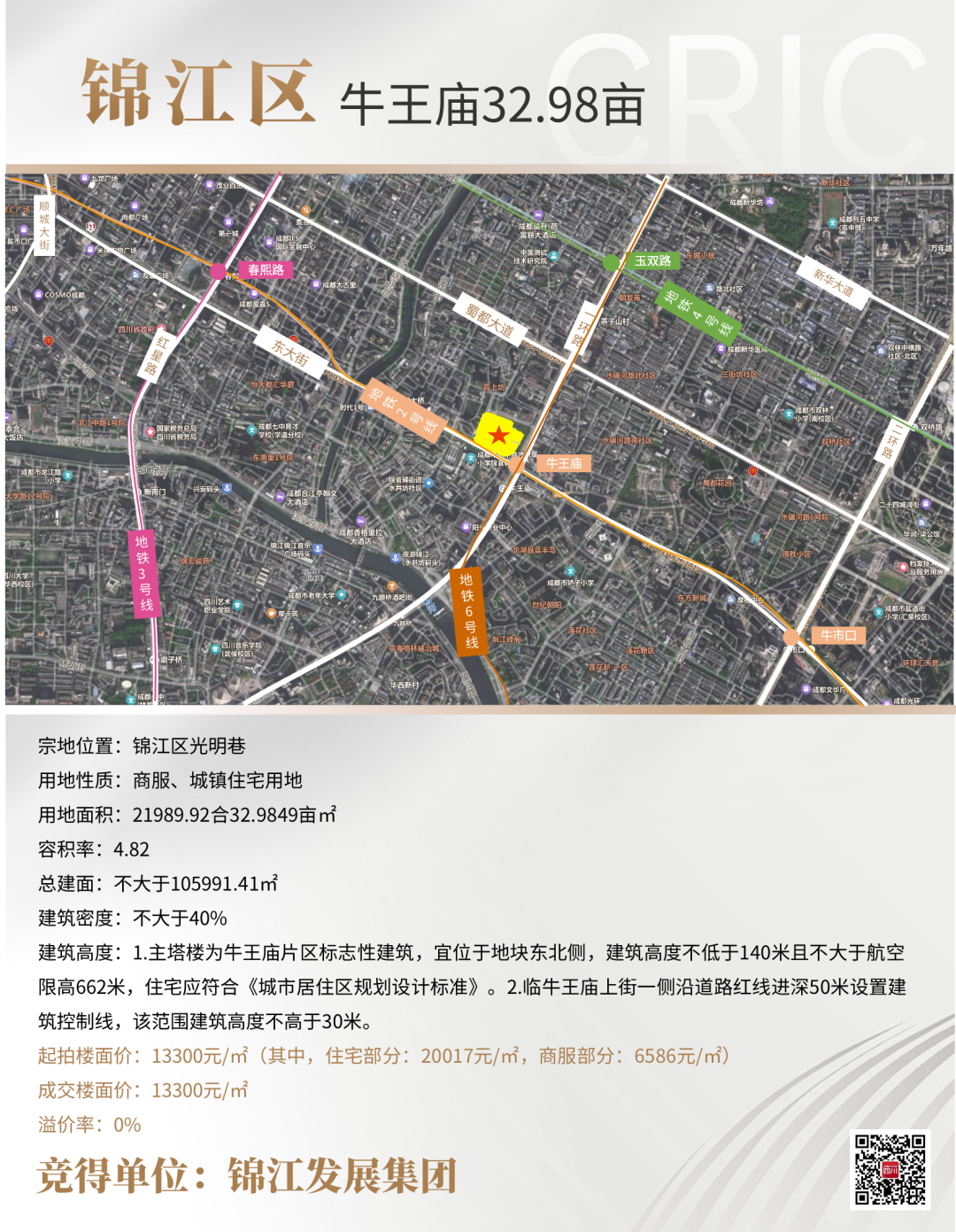 今日(12月10日),成都市锦江区一宗备受关注的地块公开拍卖。位于牛王庙板块、占地面积约32.99亩的商兼住用地,由成都恒耀锦城房地产开发有限责任公司以底价竞得,成交楼面价13300元/㎡。
