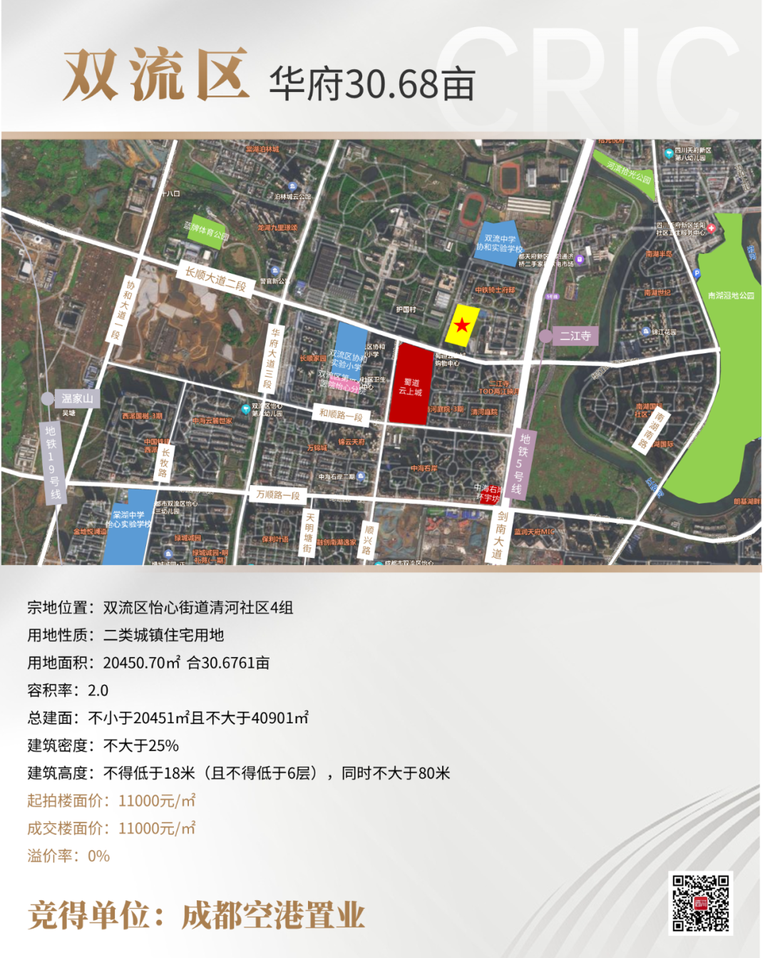 昨日(12月9日),成都双流区成交一宗宅地,地块位于双流区怡心街道,属于华府板块,起拍价11000元/㎡,最终由成都空港置业底价竞得。