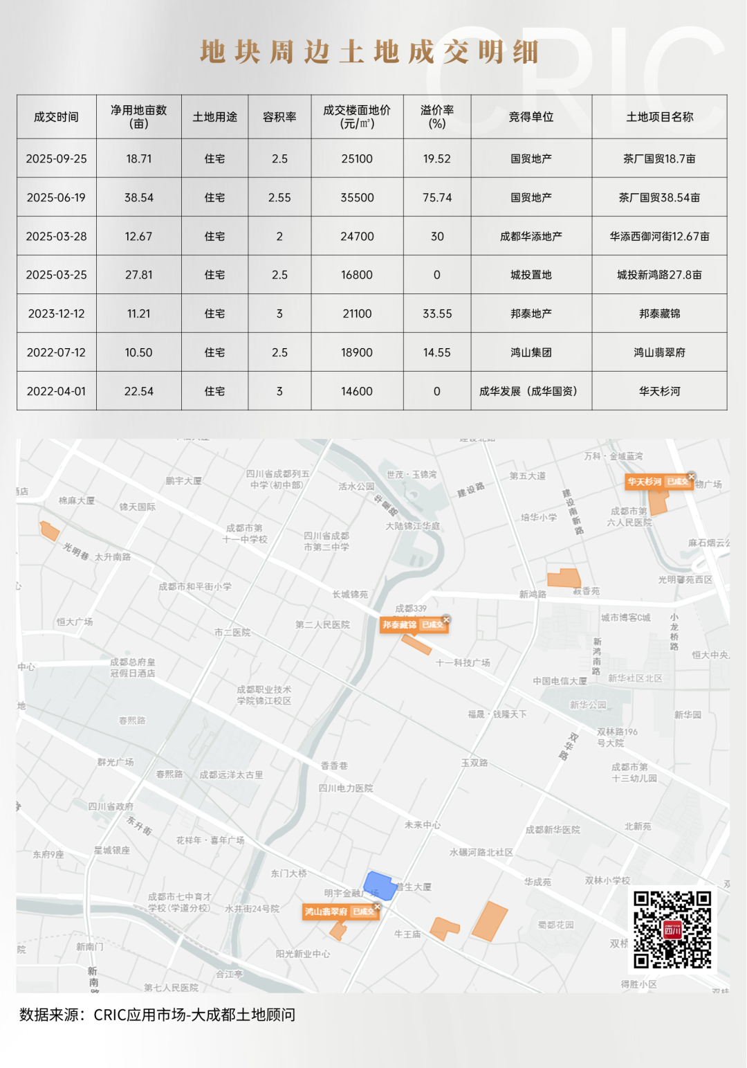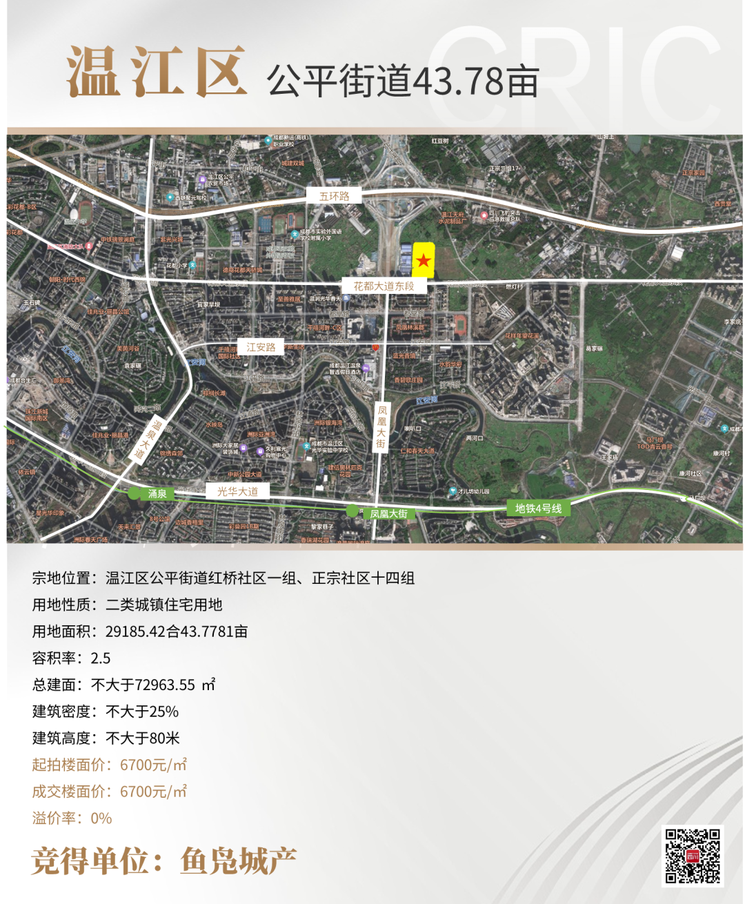 同日,成都市温江区亦有一宗住宅用地成交。该地块位于光华新城板块,面积约43.7亩,容积率2.5,最终由成都鱼凫城产实业有限公司以楼面价6700元/㎡底价摘得。