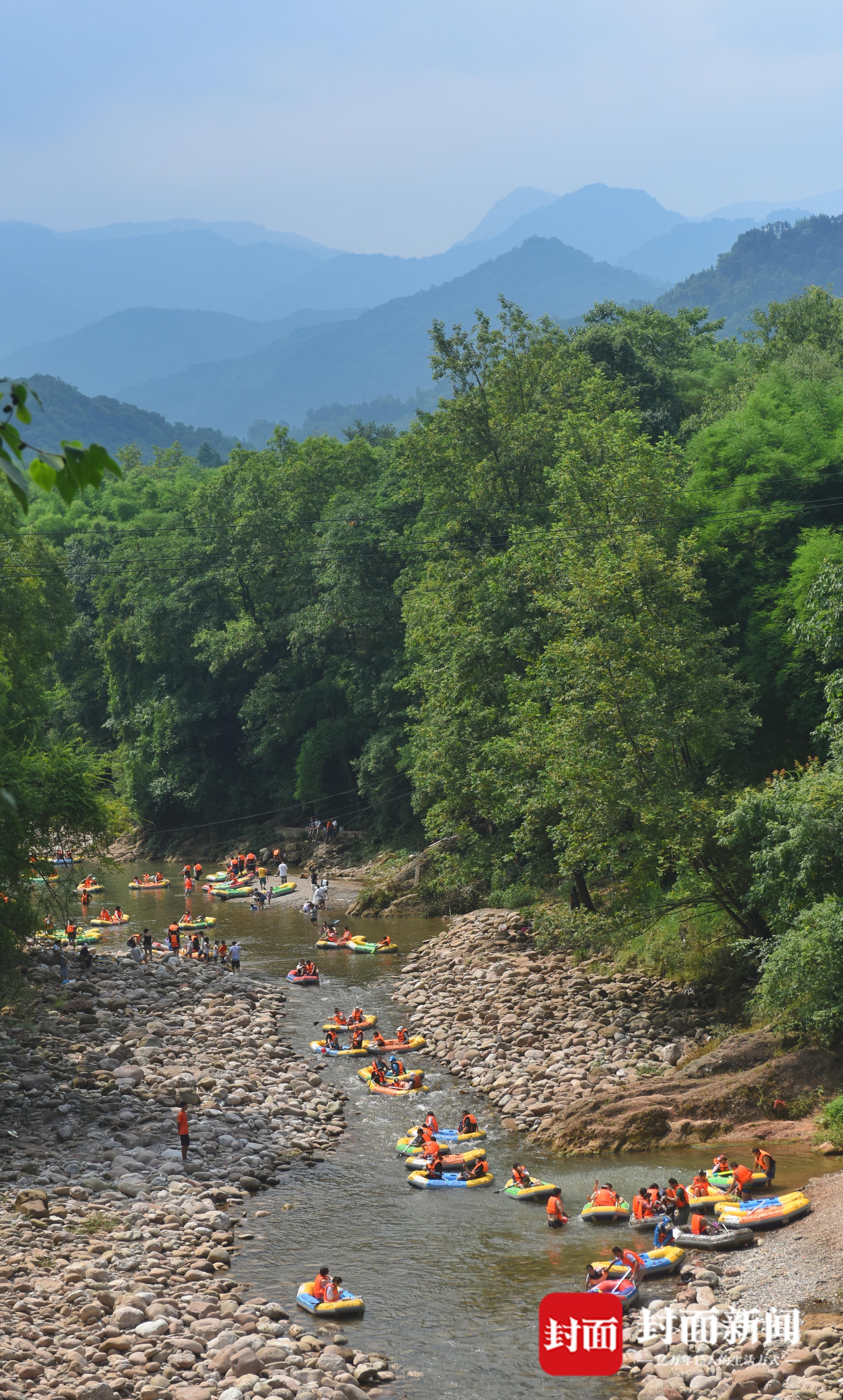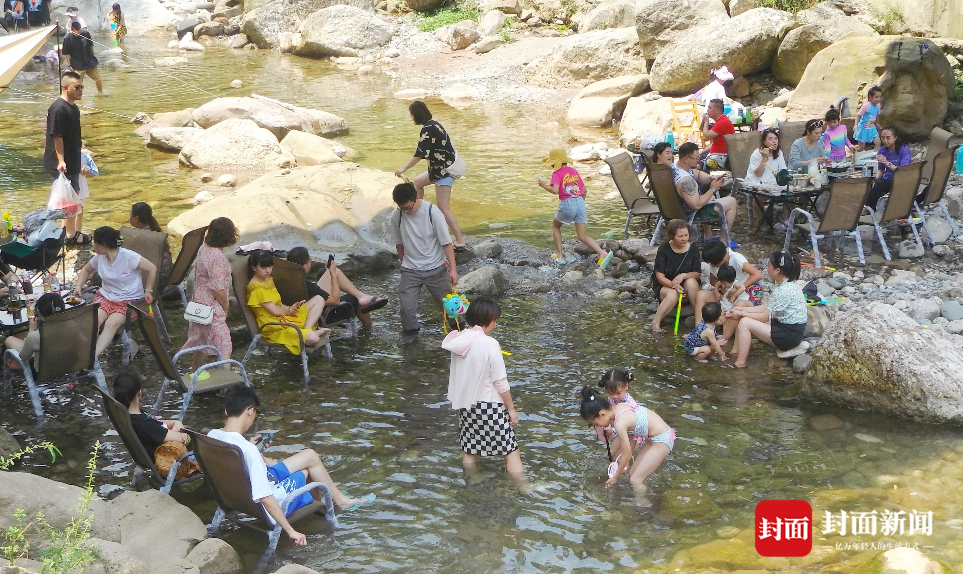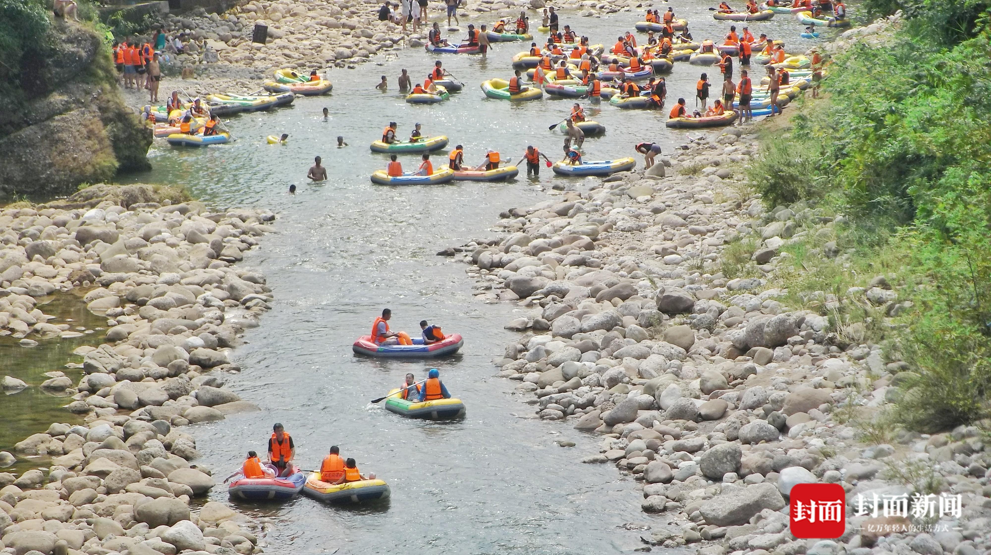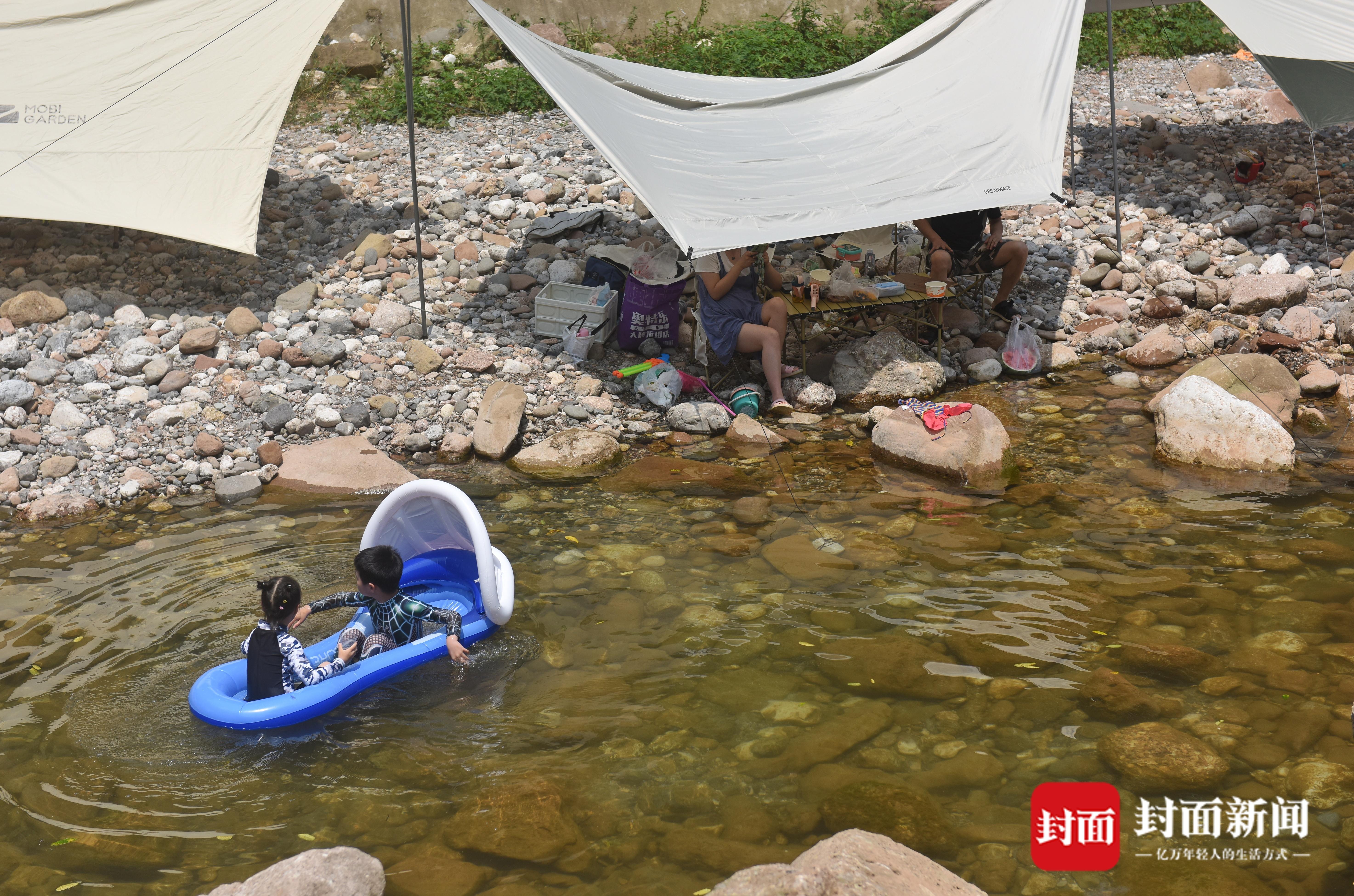 7月9日,成都持续几日的高温天气,让市民热得遭不住了,趁着周末。人们“逃离”热浪滚滚的市区,躲进山沟避暑。在崇州市街子镇干五里河,河面上尽是漂流的橡皮艇,橡皮艇归流而下。茶园村河滩上,众人在河滩上搭帐篷吹着凉风,小朋友们在水里嘻戏打水仗,过一个凉快的周末。