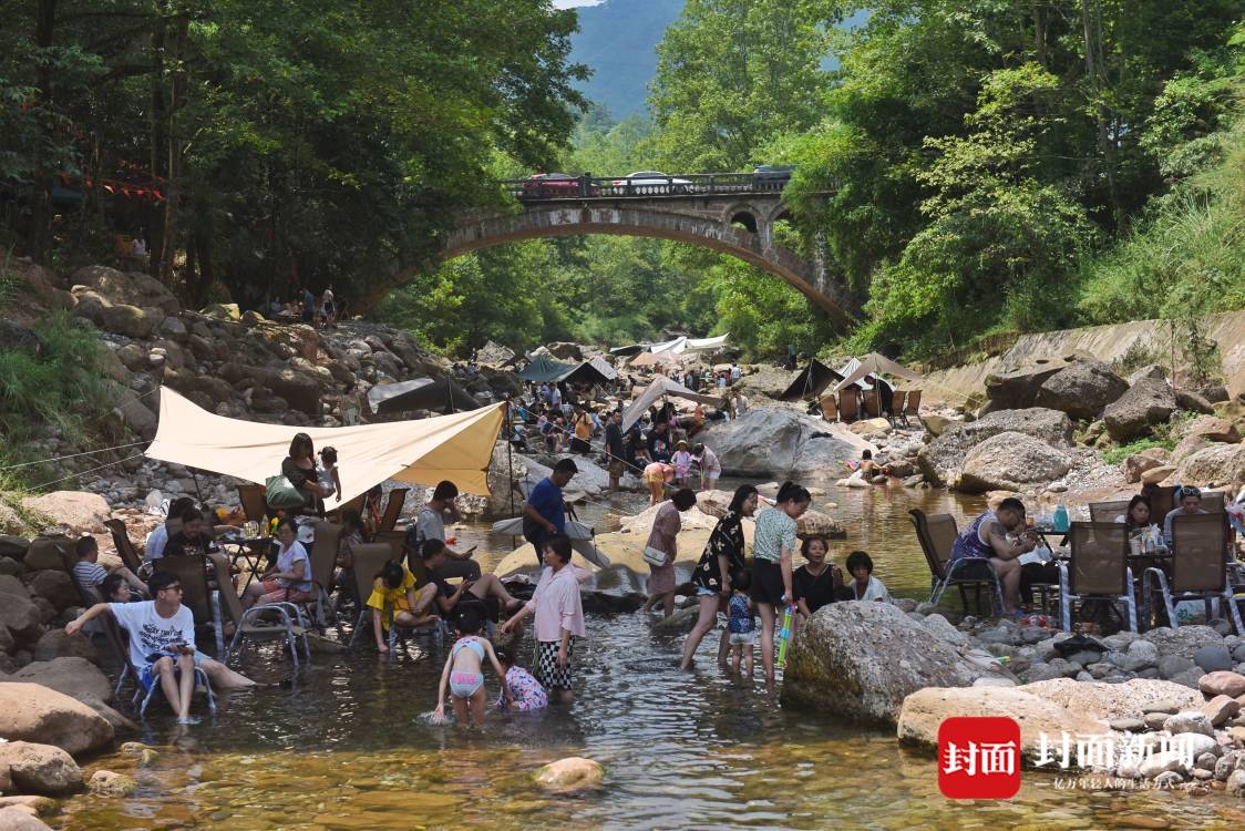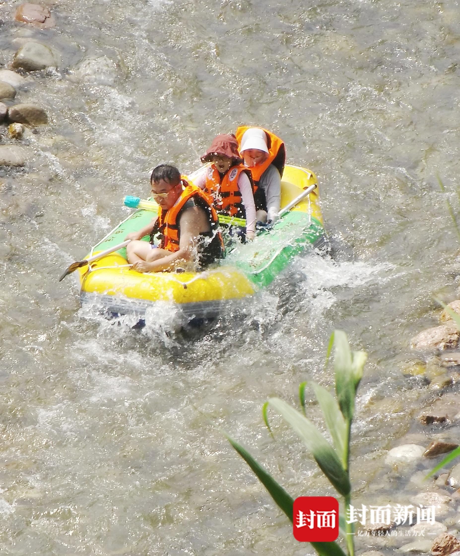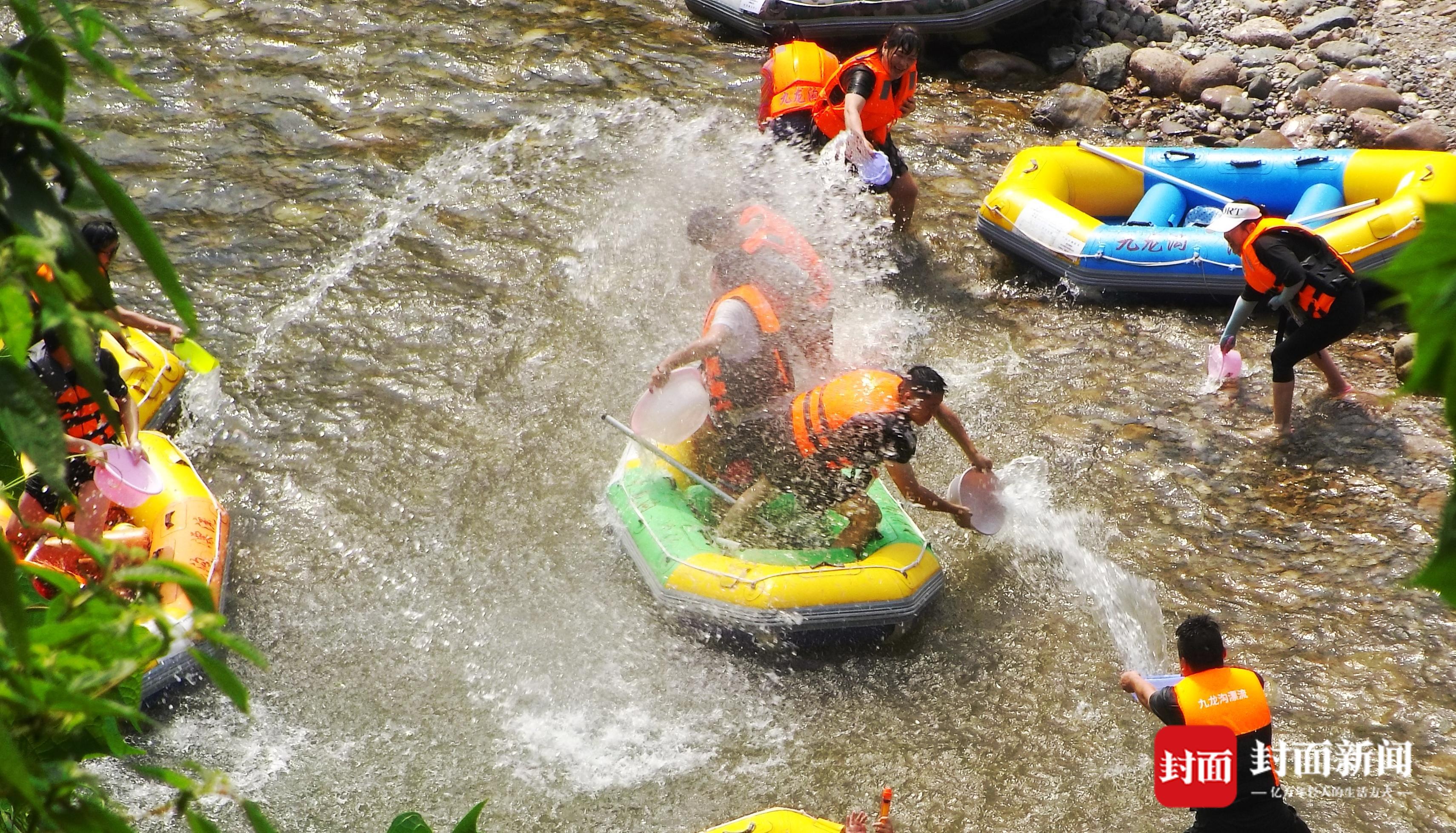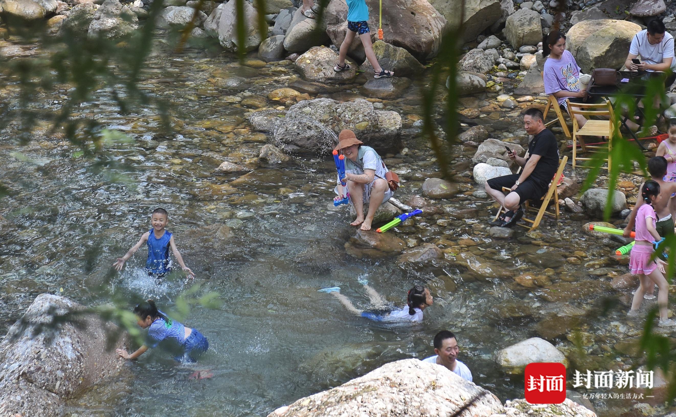 7月9日,成都持续几日的高温天气,让市民热得遭不住了,趁着周末。人们“逃离”热浪滚滚的市区,躲进山沟避暑。在崇州市街子镇干五里河,河面上尽是漂流的橡皮艇,橡皮艇归流而下。茶园村河滩上,众人在河滩上搭帐篷吹着凉风,小朋友们在水里嘻戏打水仗,过一个凉快的周末。
