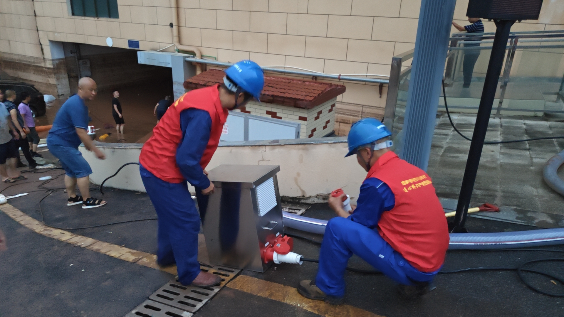 抢险队队员吕磊将水管连接头紧贴于潜水泵出水处,双手用力一压,再顺时针拧动。“咔”,连接头紧紧卡上了潜水泵出水口,抽水管被套上了连接头并扎紧。控制电源箱接入发电机,潜水泵接上控制电源箱。随后,两位队员蹒跚着将沉重的潜水泵放入地下车库洪水中。