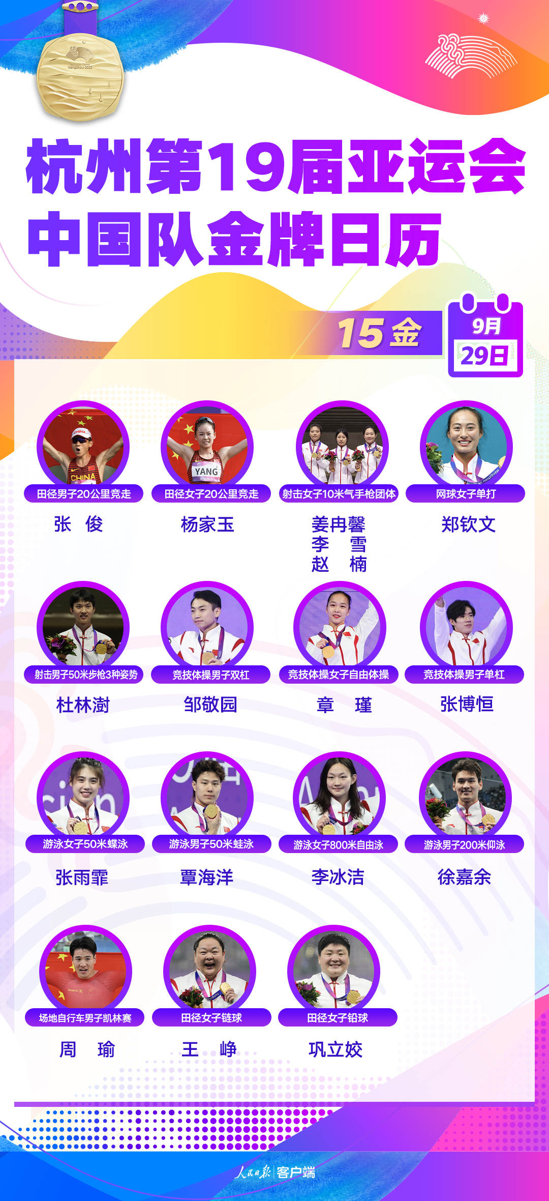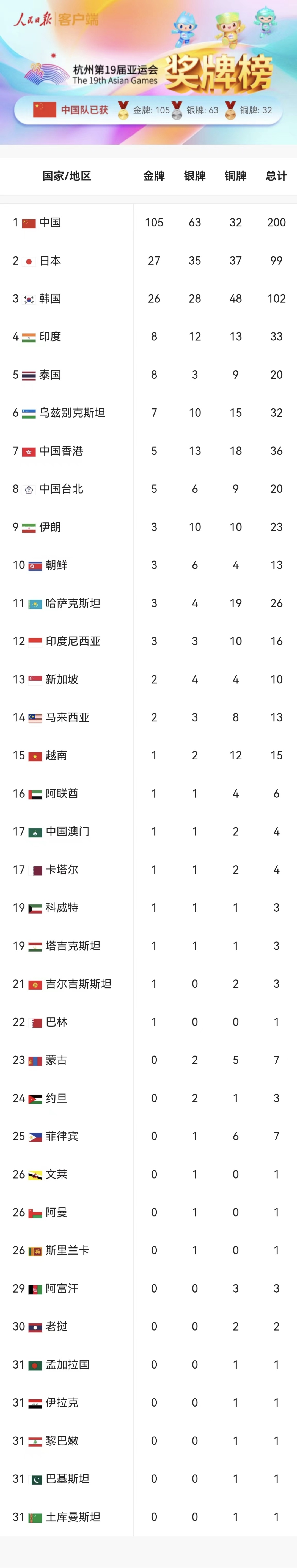 今日15金!中国队金牌总数105! 人民日报 2023-09-29 23:35 84581 今天是中秋佳节杭州第19届亚运会开幕后的第6个比赛日截至目前,中国体育代表团已收获15枚金牌截至28日晚中国队已获得105金63银32铜在奖牌榜位列第1祝贺中国队!继续加油! 评论 1 阆中鹤峰乡川主庙村第一书记李林 2023-09-30 发表于四川 祝贺 我要评论