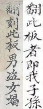 比如清代《论学巵言》卷末牌记直接印有“翻刻此板,男盗女娼”。道光二十五年(1845)广州苏氏丹桂堂刻印的历书《通书》中,写有“如有假冒招牌者,男灾女祸”。文人痛骂起盗版者来,完全不在意形象了,有的刻本印着“翻此板者即我子孙”,又有刻印“翻刻者子孙不昌”“盗版者断子绝孙”之类。