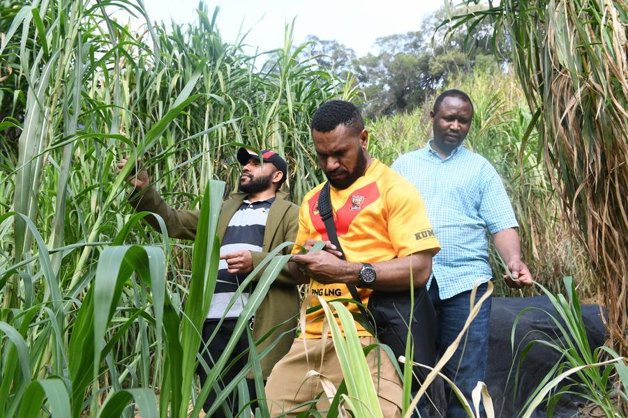 2024年3月28日,在位于福州的福建农林大学,来自卢旺达和巴布亚新几内亚的学生在“国际菌草苑”内查看菌草长势。新华社记者 林善传 摄