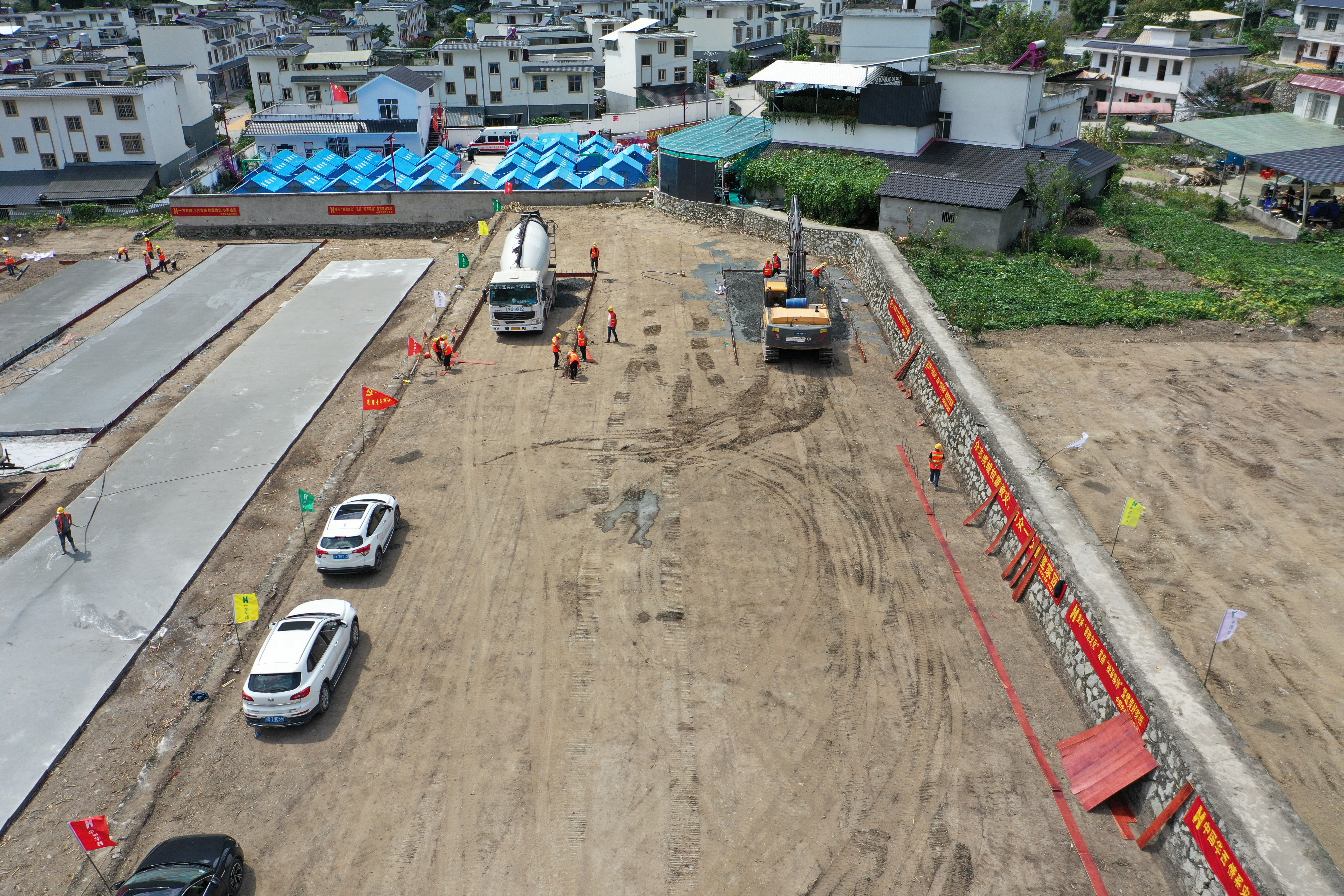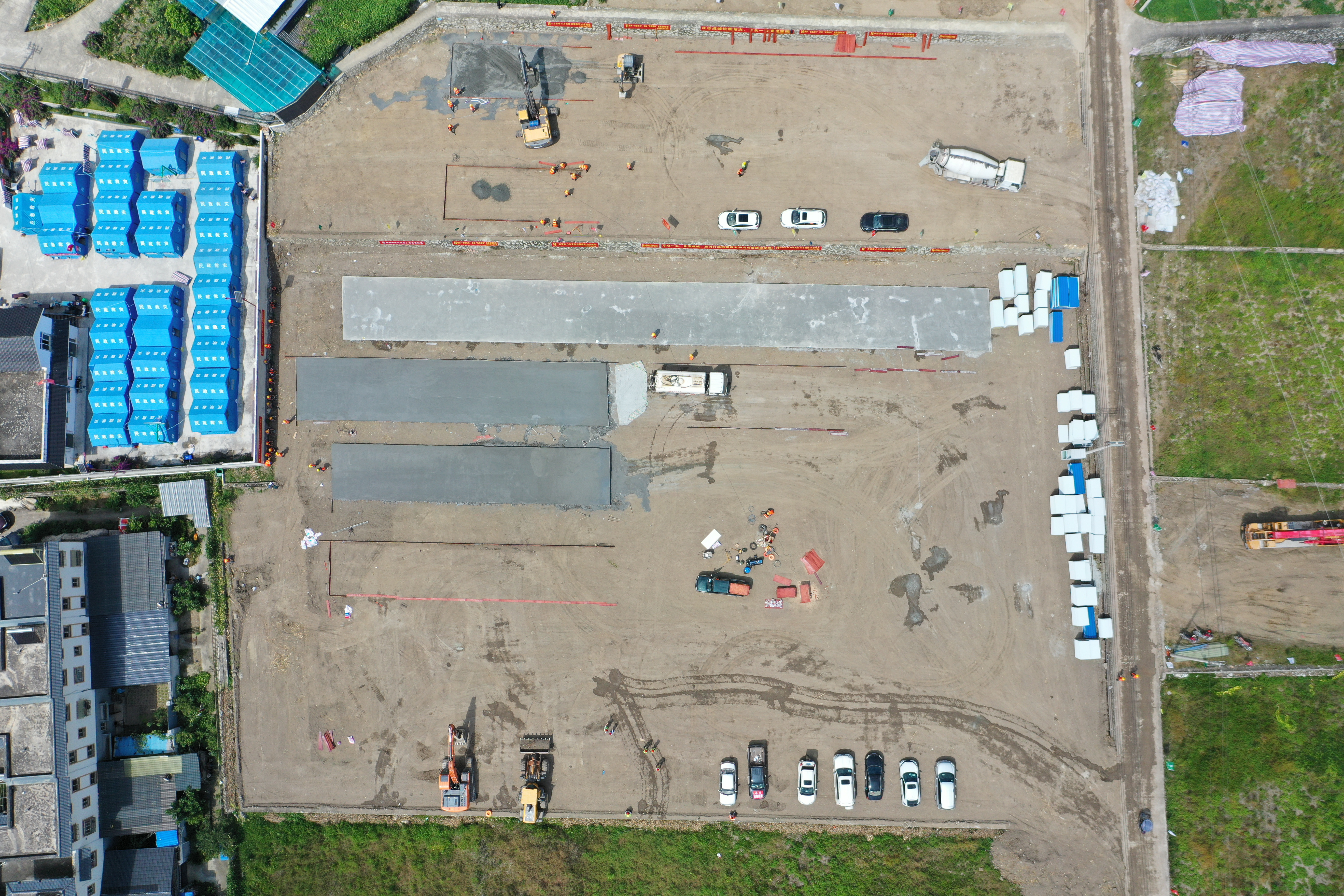 9月12日13时许,四川甘孜泸定县得妥镇繁荣村的一片田地旁,作业车辆来回穿梭。这里是得妥镇过渡安置房施工现场,施工人员已经硬化好三处活动板房的地基,旁边摆放着蓝白相间的活动板房材料。施工单位预计在一周内,要把33亩地上全部建上活动板房,同时完善各类配套设施。
