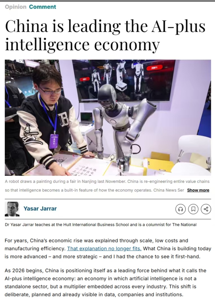 文章最后说,中国的经验十分明确:中国并非将人工智能视为普通技术潮流,而是将其作为国家发展战略进行系统部署。通过数十年来对规划布局、资金投入、人才培养、产业配套与落地执行的全链条协同,中国正实现从价格优势向价值创造的战略转型,将智能技术深植于经济发展核心。这场深刻变革,正是当今世界需要理解并借鉴的中国范式。