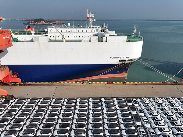 在江苏省连云港,中国生产的汽车正加紧装船出口海外。