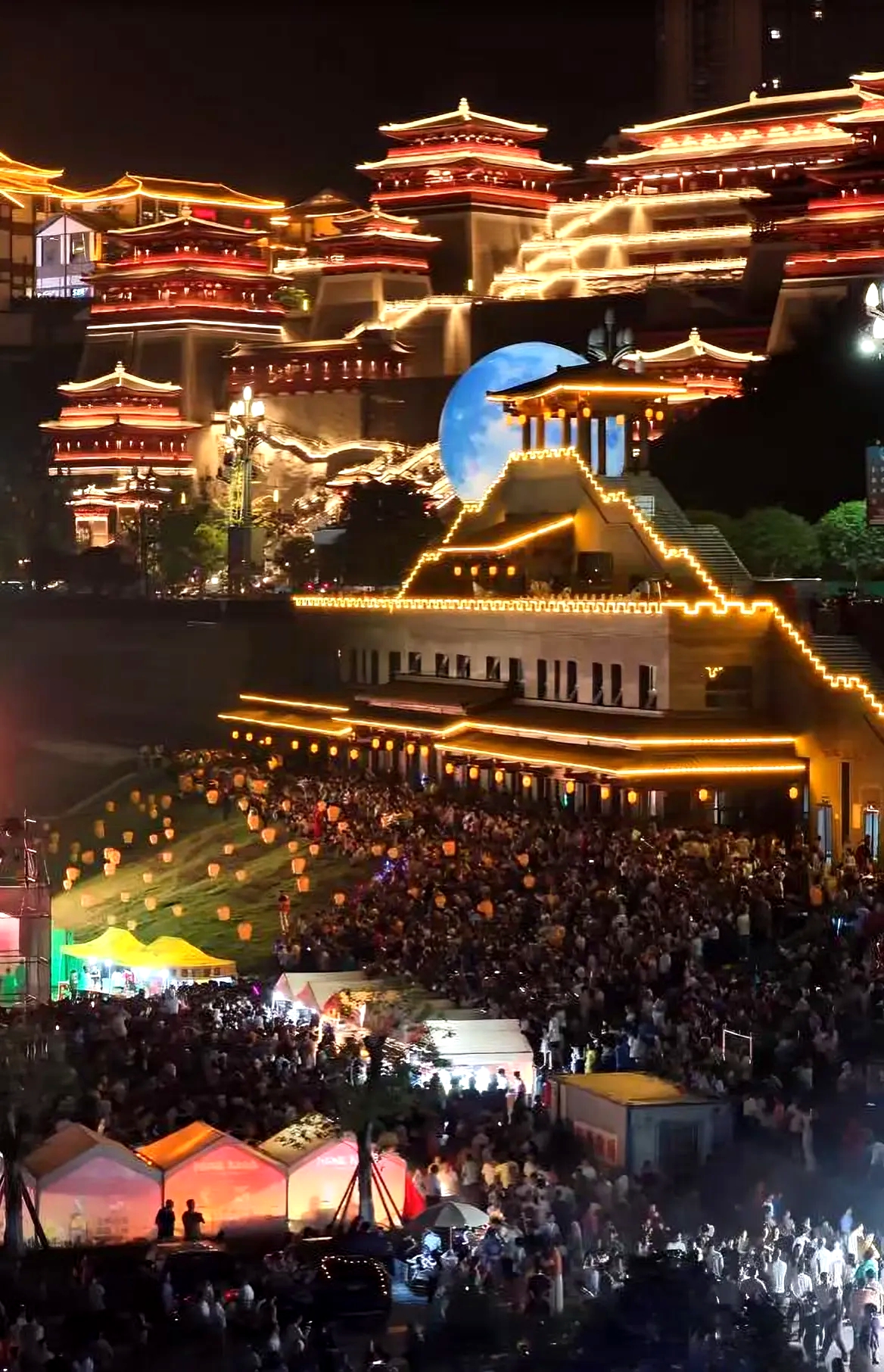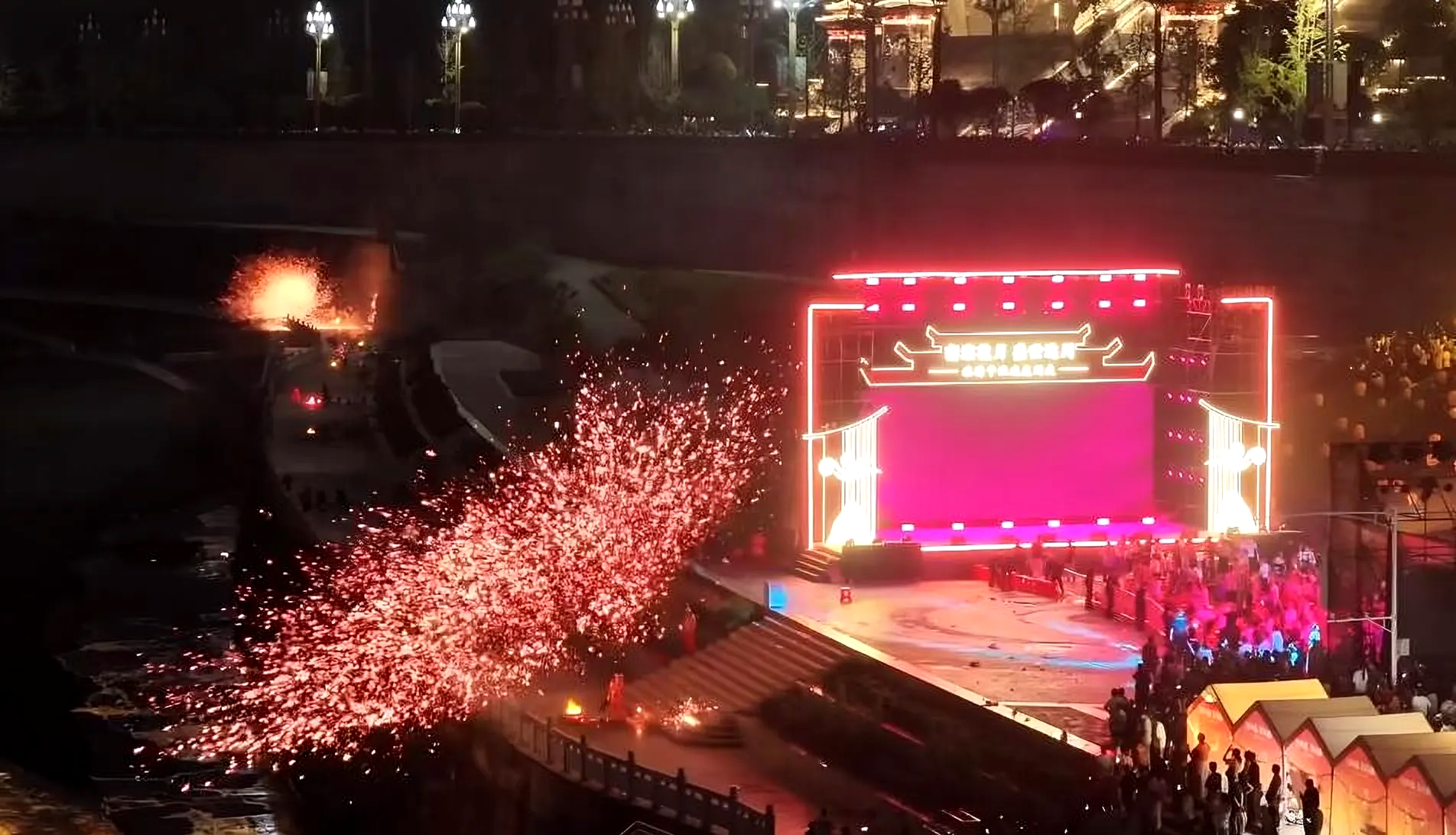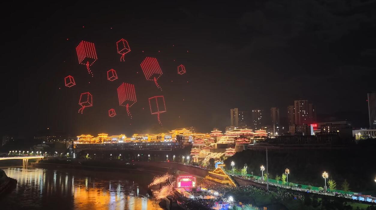 “梦里巴国·三里古街”在双节期间同样成为欢乐的海洋。非遗“火壶”绝技惊艳亮相,绚烂的烟花瀑布点亮夜空。