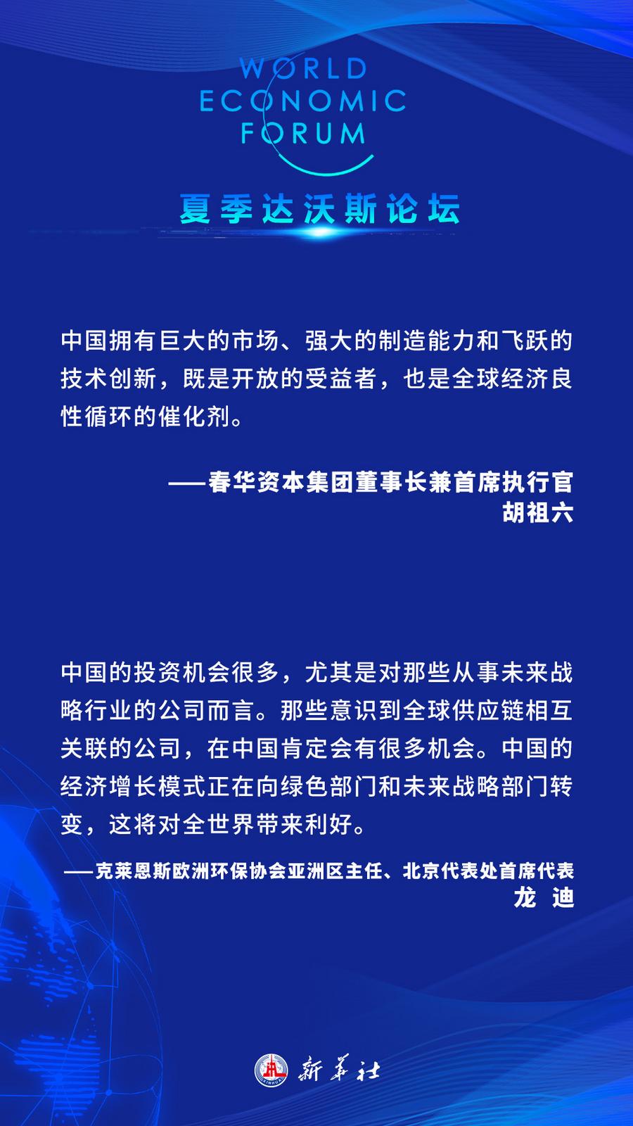 多国与会人士表示,中国经济韧性强、市场大、投资机会广,有能力助推全球经济增长,期待通过夏季达沃斯论坛更好了解中国经济,加强交流对话,探寻多方合作机遇,助力世界经济复苏。