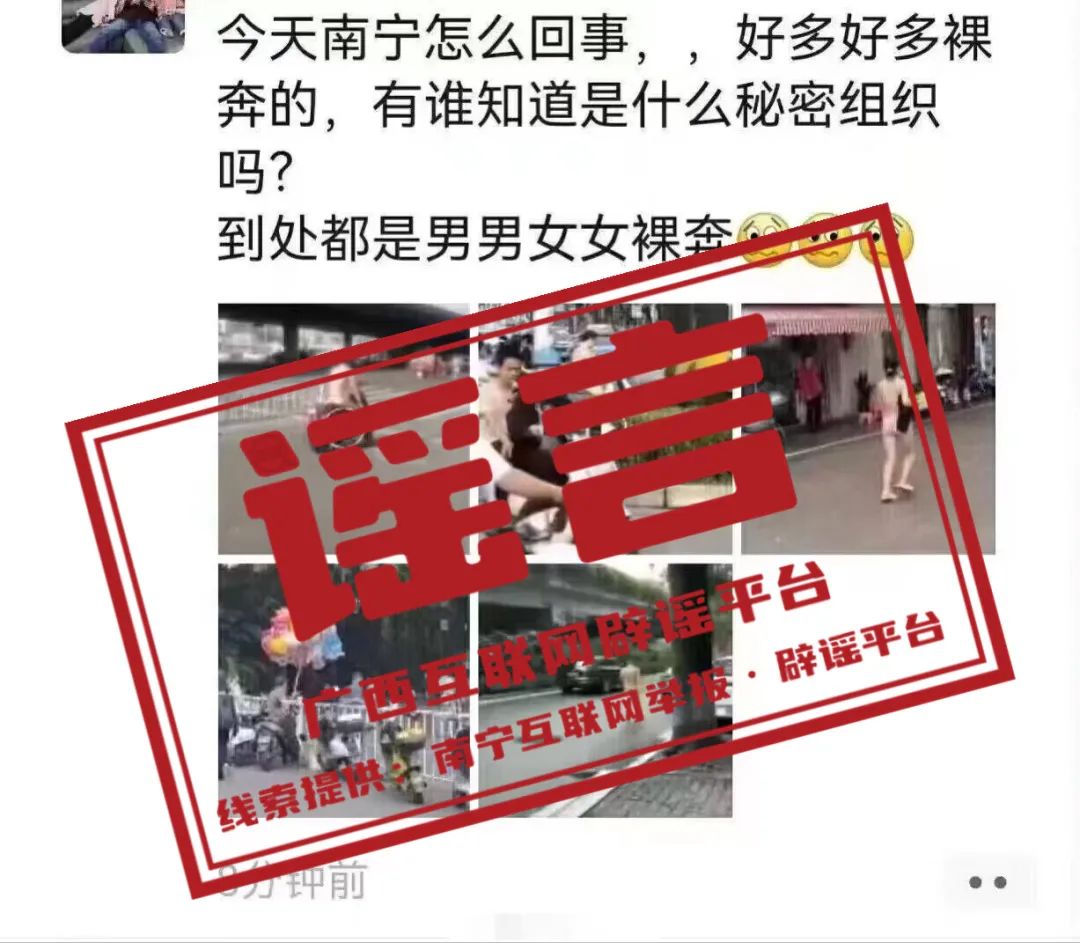 经南宁互联网举报·辟谣平台查证,该信息为虚假谣言,多个网传视频、照片事发地不在南宁,南宁没有所谓的约裸组织。
