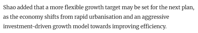 《南华早报》援引分析人士的表述认为,随着中国经济从快速城镇化和投资驱动型增长模式转向高质量发展,中国下一个五年规划可能会设定更灵活的增长目标。