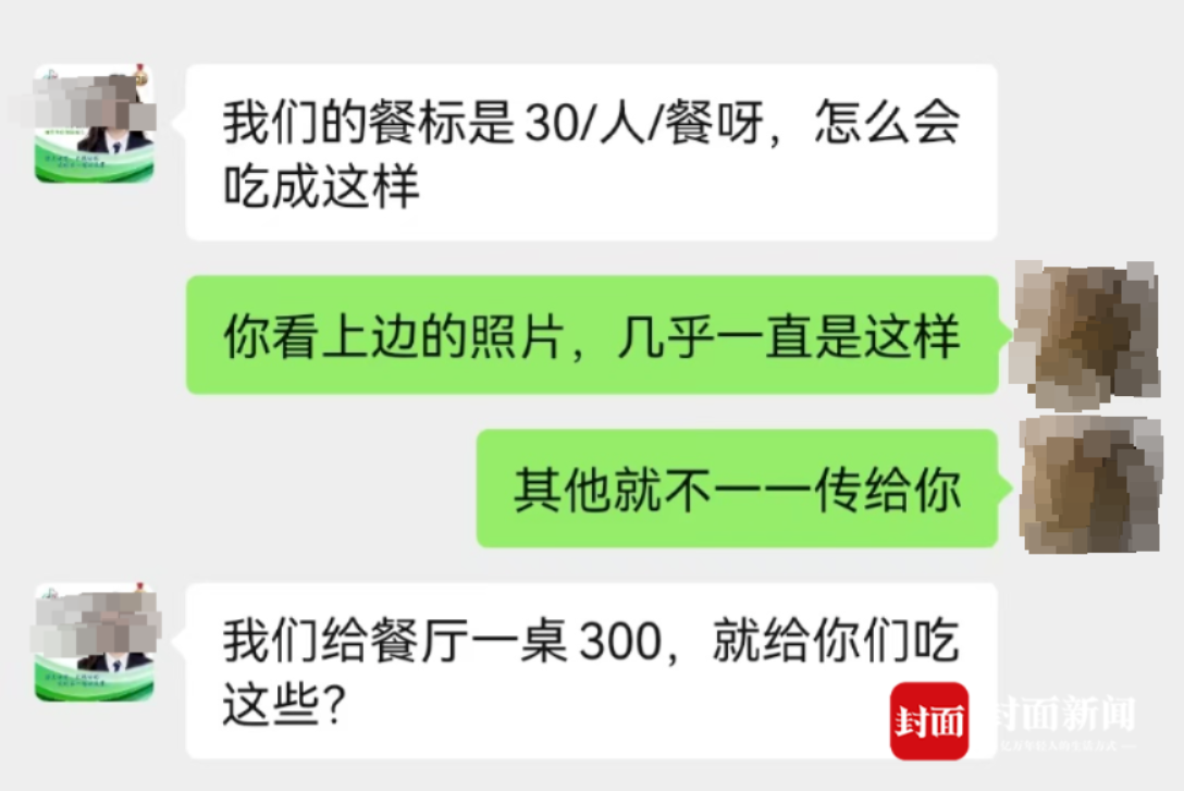 记者向客服发送照片,反馈了餐饮和住宿问题。客服表示震惊:“我们交的是300元每桌的餐费,每人30元的标准,就给你们吃这些?怎么会吃成这样?”