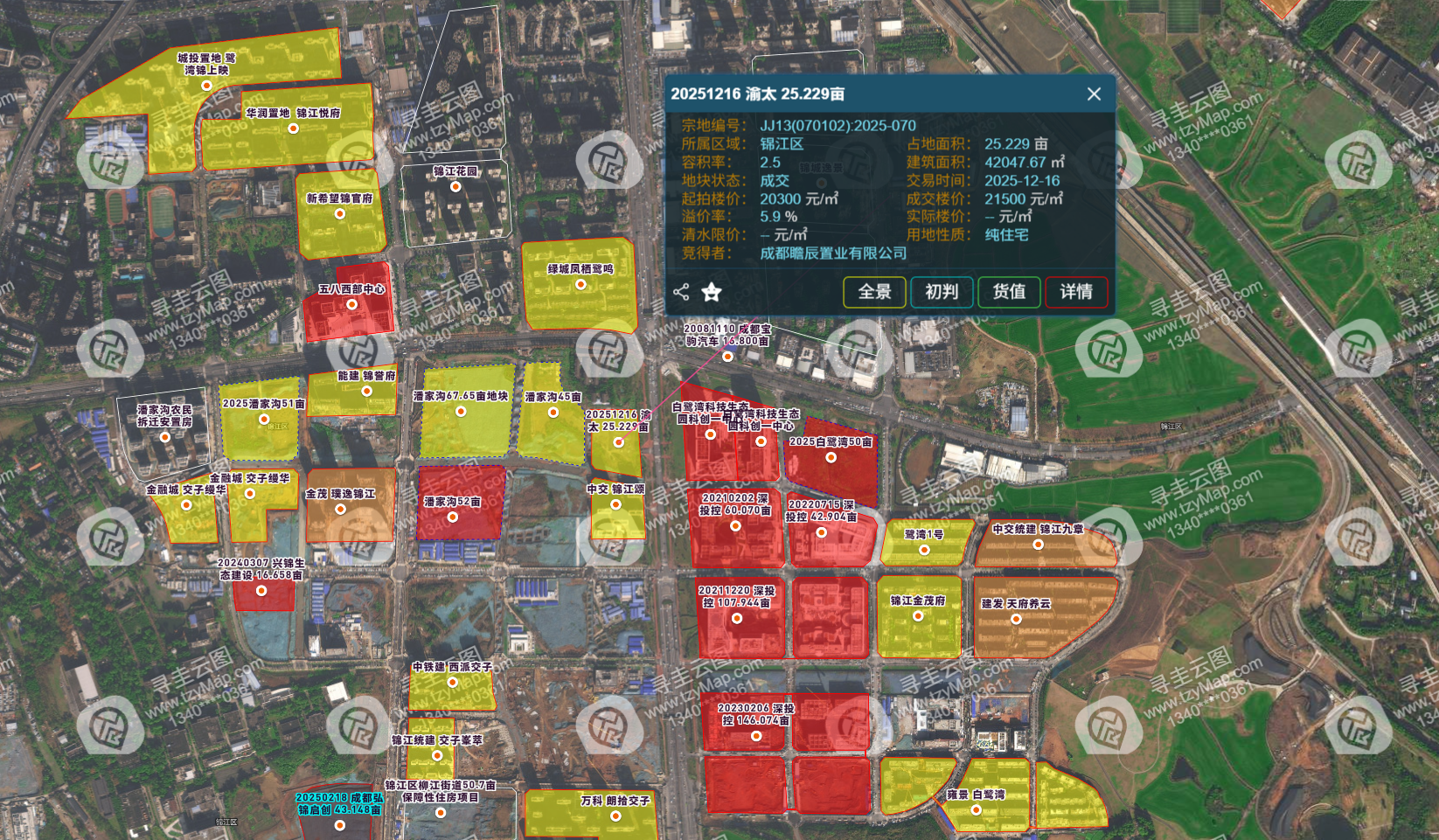 锦江区宗地位于林家坝板块,面积约25亩,容积率2.5,起拍楼面价达20300元/㎡,这是目前成都起拍楼面价第二高的地块,也是林家坝板块时隔一年的首次供地,备受市场关注。现场有9家房企报名,最终,该地块由成都瞻辰置业有限公司(滨江润达丰)以21500元/㎡竞得,溢价率约5.91%。