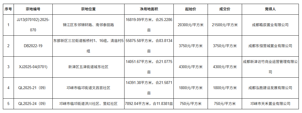 今日(12月16日),成都有5宗地块出让,合计出让面积约163亩,分别位于锦江区、东部新区、新津区、邛崃市。其中锦江区地块溢价成交,其余地块底价成交。