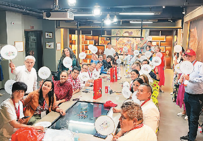 “汉语桥”哥伦比亚教育工作者访华团组到天津杨柳青古镇体验年画制作。