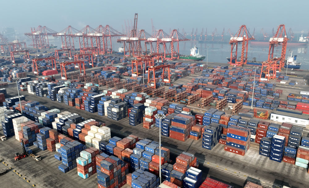 在浙江宁波舟山港梅山港区码头,大型设备在吊运集装箱(2024年1月24日摄,无人机照片)。新华社记者 黄宗治 摄