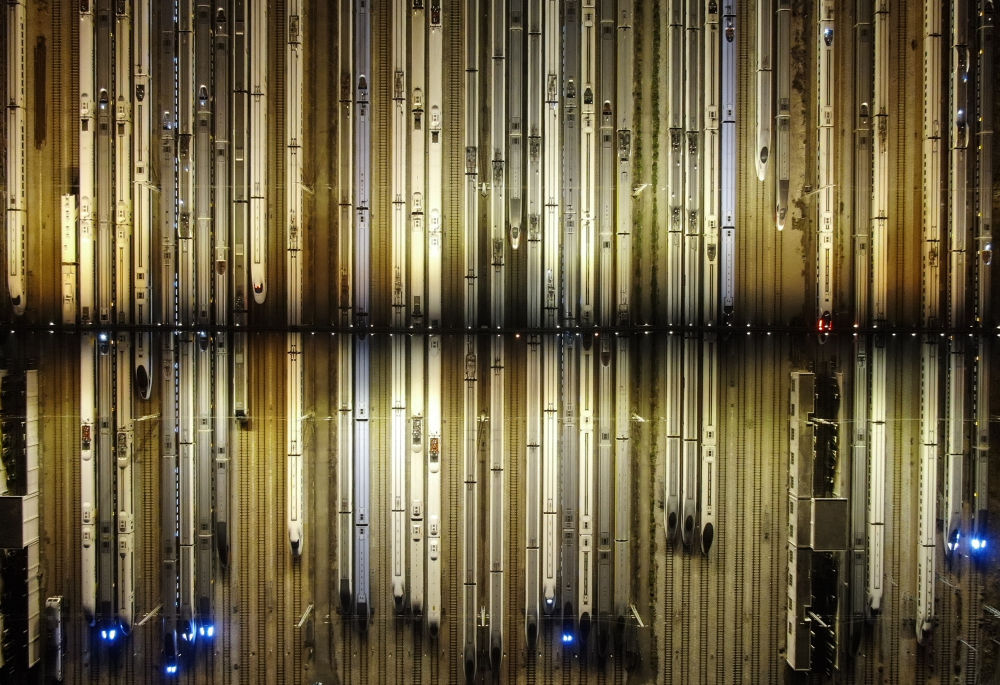 2024年1月26日凌晨,动车组列车停靠在广州动车段的存车线上(无人机照片)。新华社记者 邓华 摄