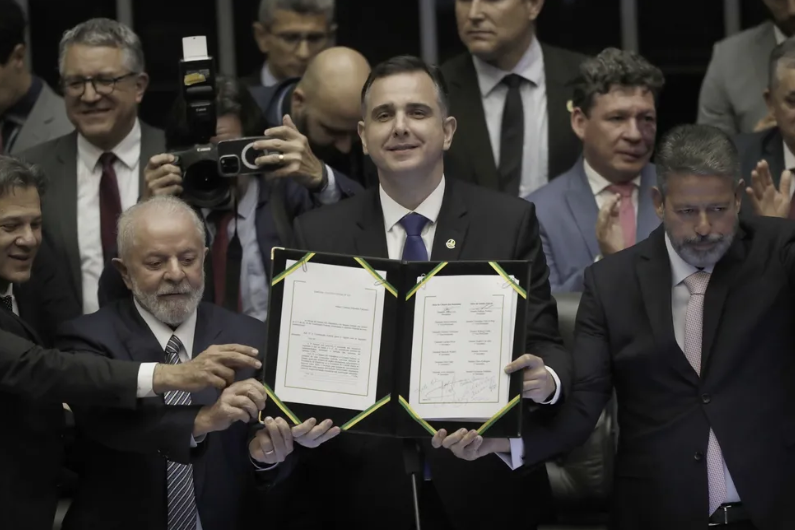 当地时间12月20日,巴西国会召开会议,颁布有关税收改革的2023年第132号宪法修正案,该国总统卢拉、财政部长费尔南多·阿达、参议长罗德里戈·帕切科及众议长亚瑟·里拉等多名政要出席会议。