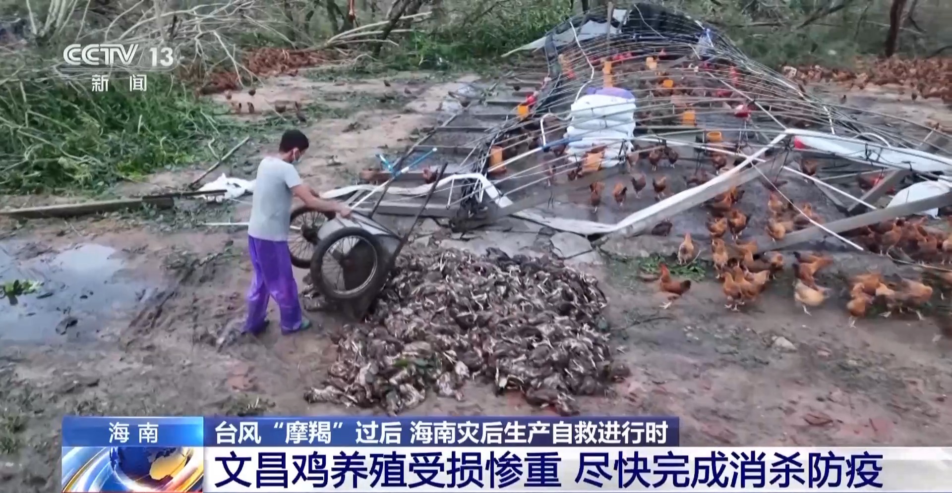 这次台风给海南的农业、养殖业也带来非常严重的影响。文昌鸡的养殖户、养殖企业都遭到不同程度的损失。一位养殖户介绍,他养殖了近2万只鸡,台风过后,有80%的鸡死亡。因为鸡怕水怕冷,一部分是被风吹雨淋冻死的,还有一部分是被倒塌的设施设备砸死的。眼下,当务之急就是将活着的鸡和死鸡分离,死鸡进行掩埋消杀,活鸡也要防范鸡瘟、禽流感等疫病的传染。