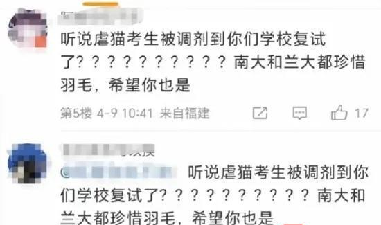 4月9日,有网络传言称,疑因有“虐猫”前科被南京大学研究生考试拒绝录取,随后又未进入兰州大学调剂拟录取名单的徐某某,进入了西南科技大学的调剂系统。