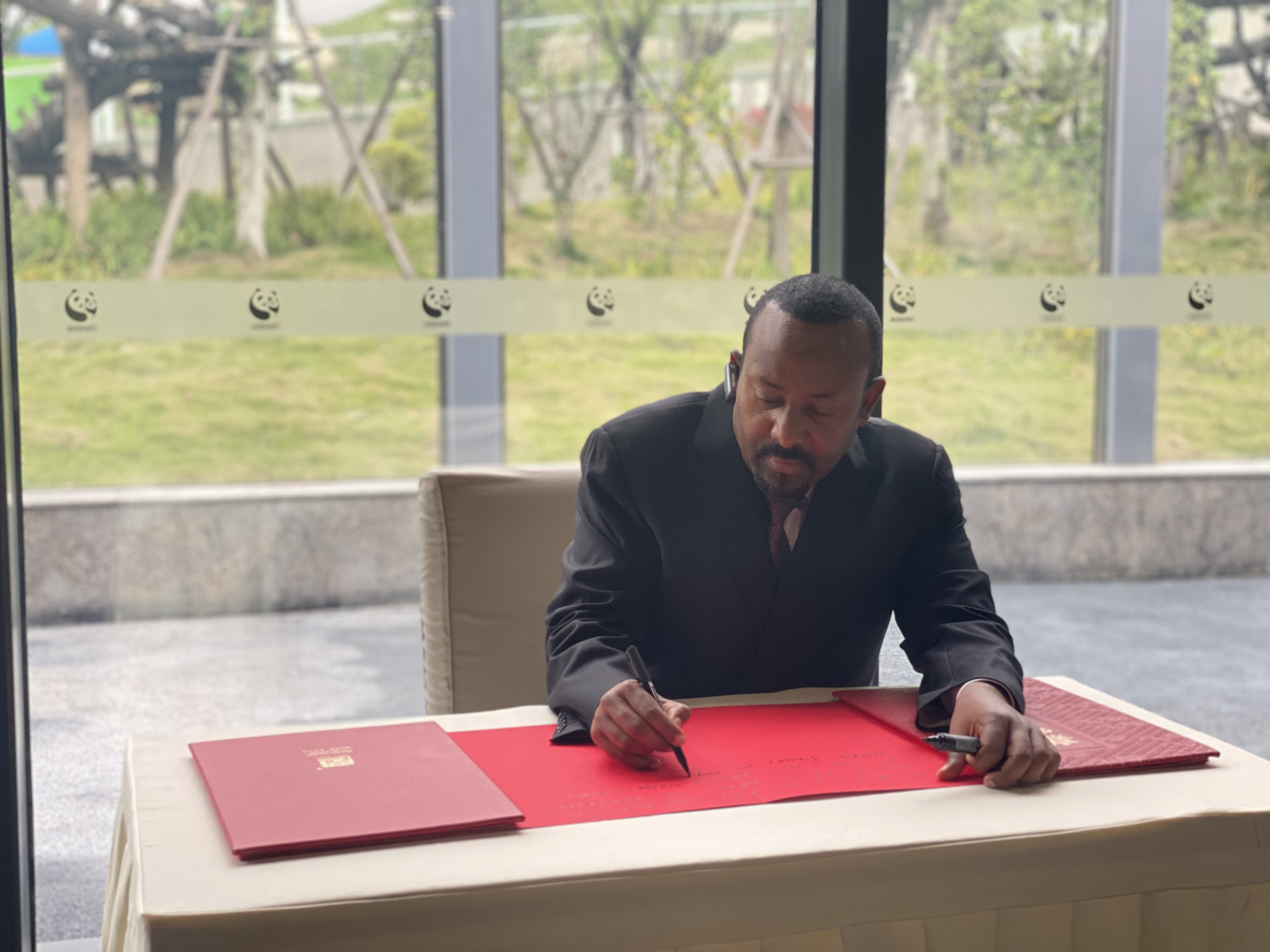 看完一圈大熊猫。阿比已然成为大熊猫的粉丝。他开心地提笔,在留言簿上手写了一段寄语。然后他说:“真希望埃塞俄比亚也有一只真的大熊猫啊!”