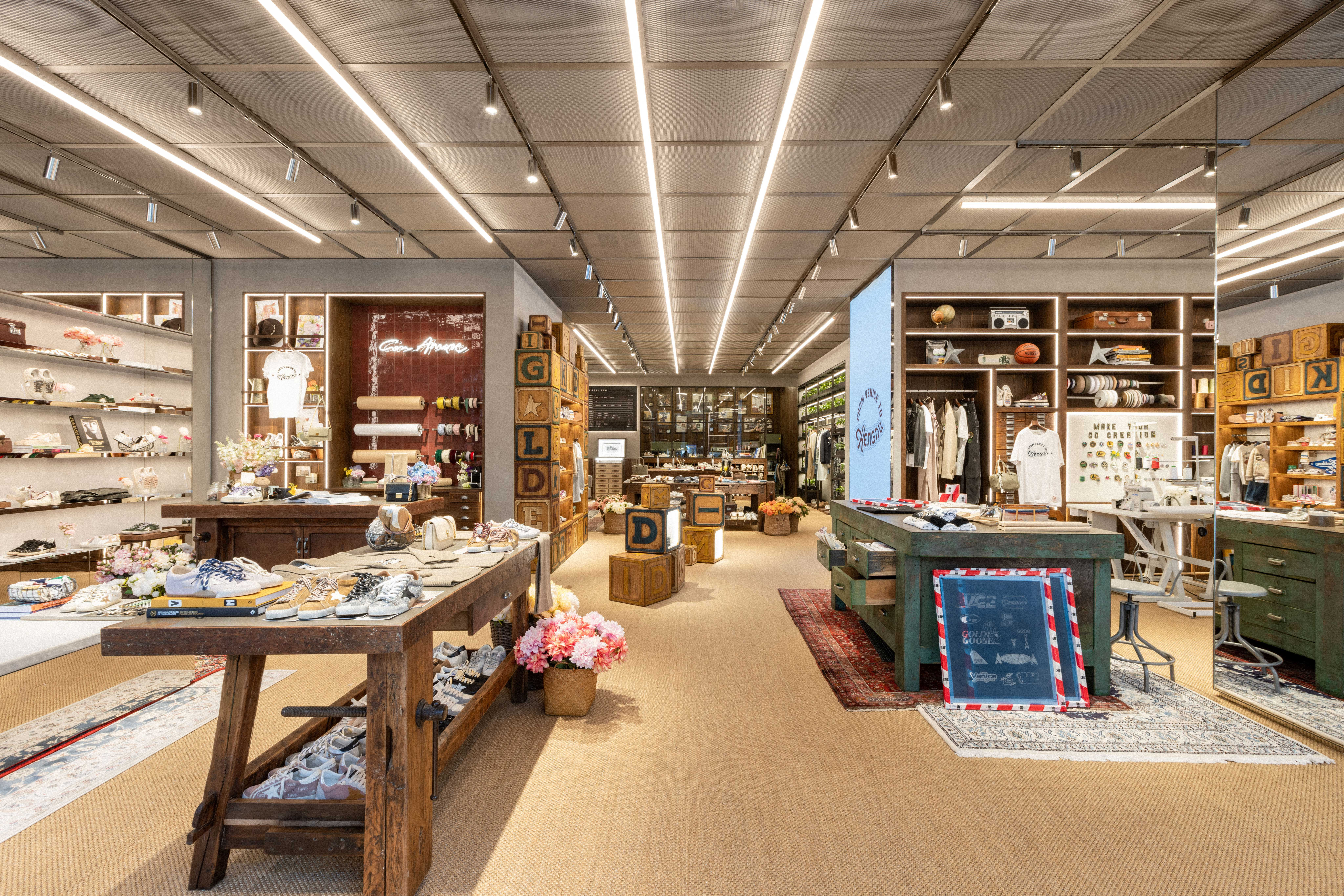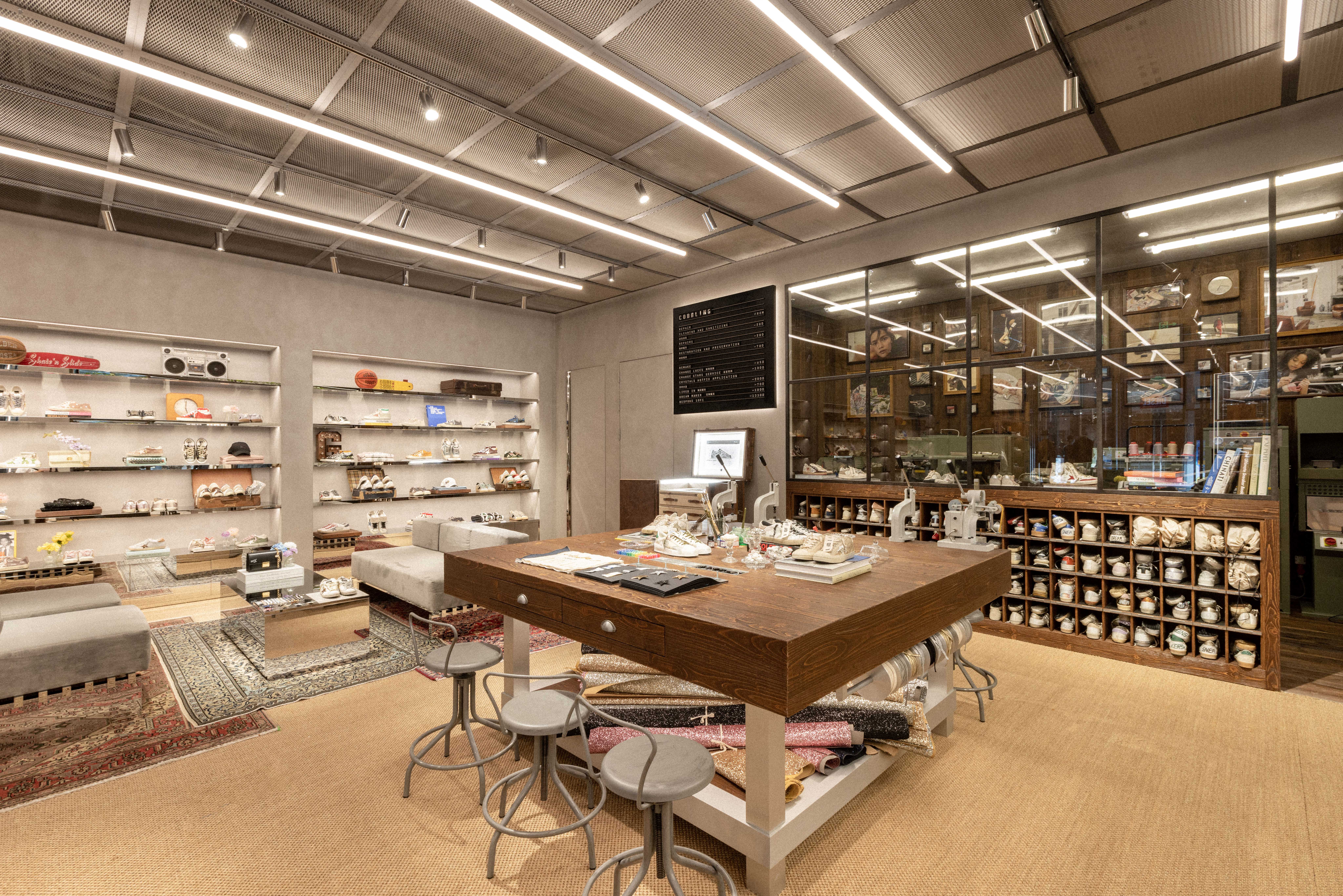 店内设计以工业风为基调,原始清水混凝土墙面与复古木质家具相映成趣,营造出粗粝而温暖的氛围。中心区域的“手工艺实验室”成为最大亮点,提供Co-Creation共创体验与CALZOLERIA焕新服务。顾客可在品牌工匠及驻店艺术家指导下,对鞋履、成衣进行个性化改造,如更换星星标识、烫印水晶或刺绣手绘,甚至从零开始共创独一无二的鞋款。