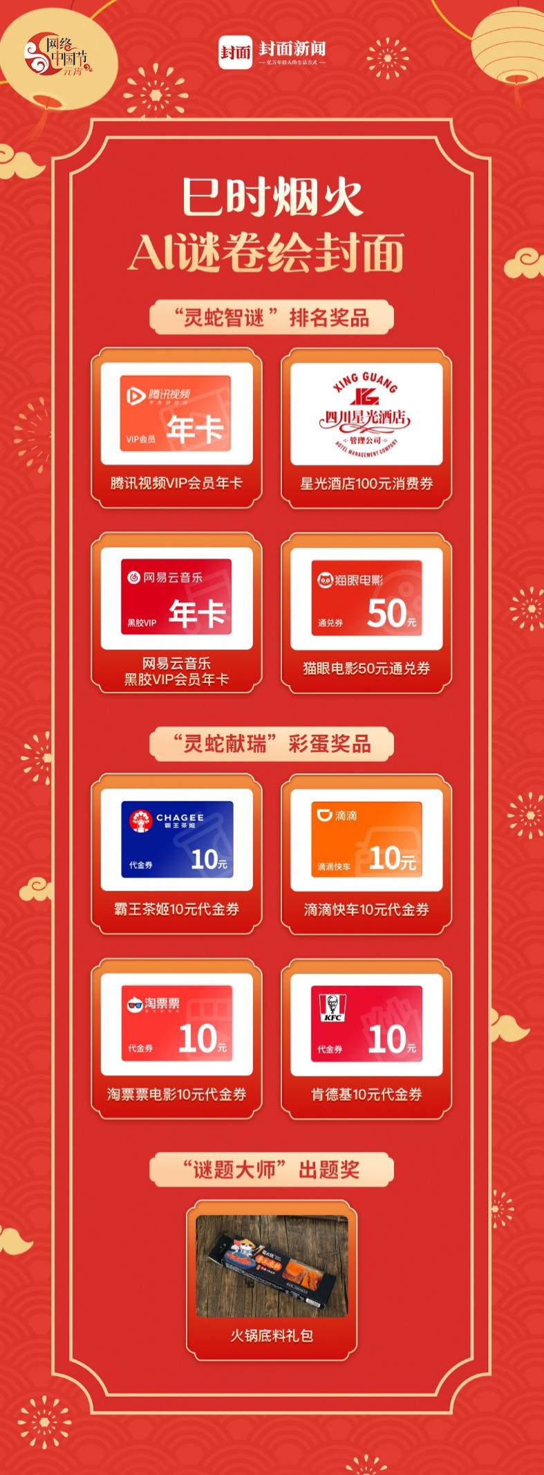 在活动首页或微博/微信/小红书封面新闻官方账号活动话题下留言提交你的宝藏原创灯谜,优质作品将入选“AI谜库”,被亿万用户挑战!更能获得既暖心又暖胃的元宵火锅底料礼包。
