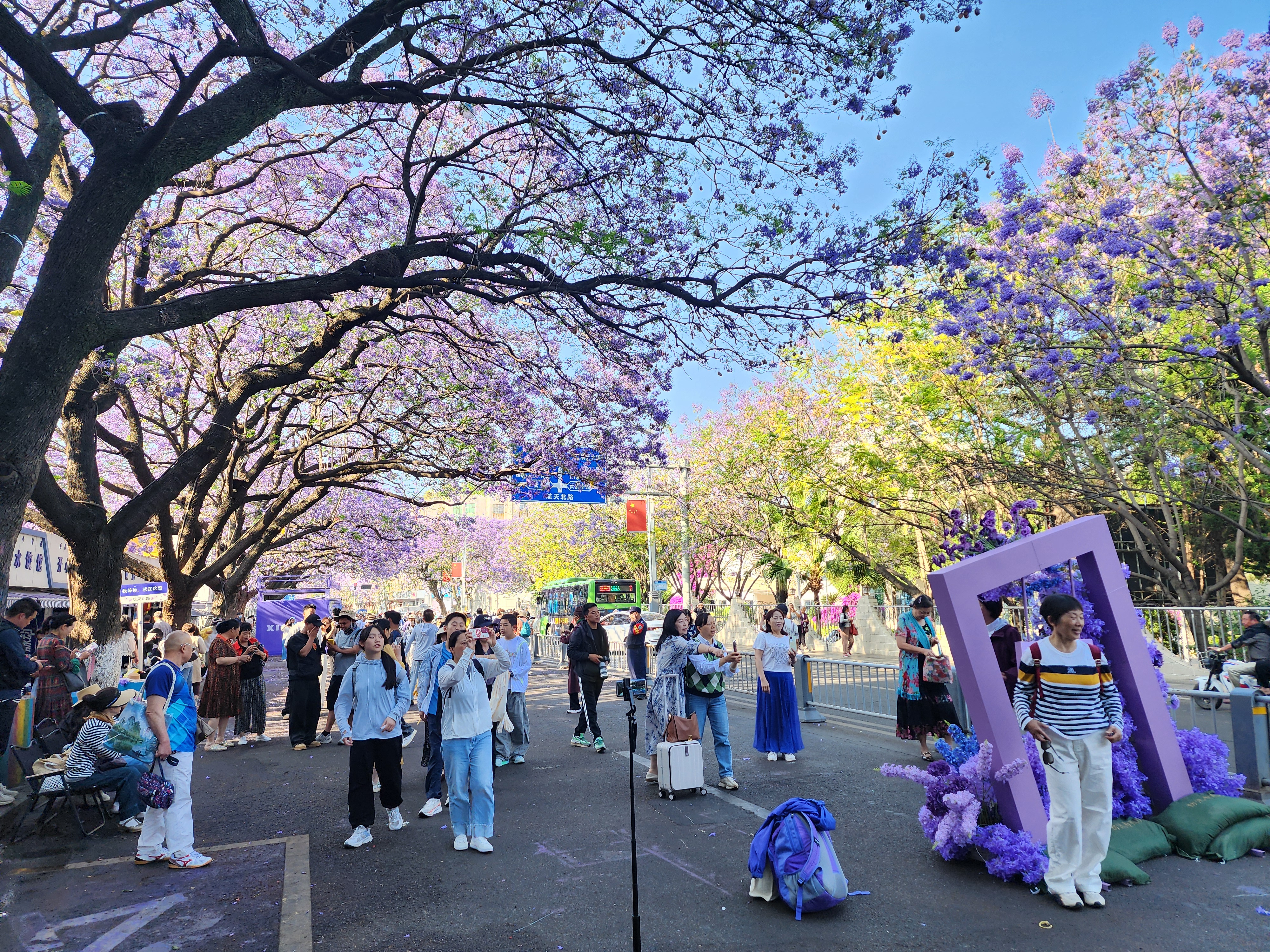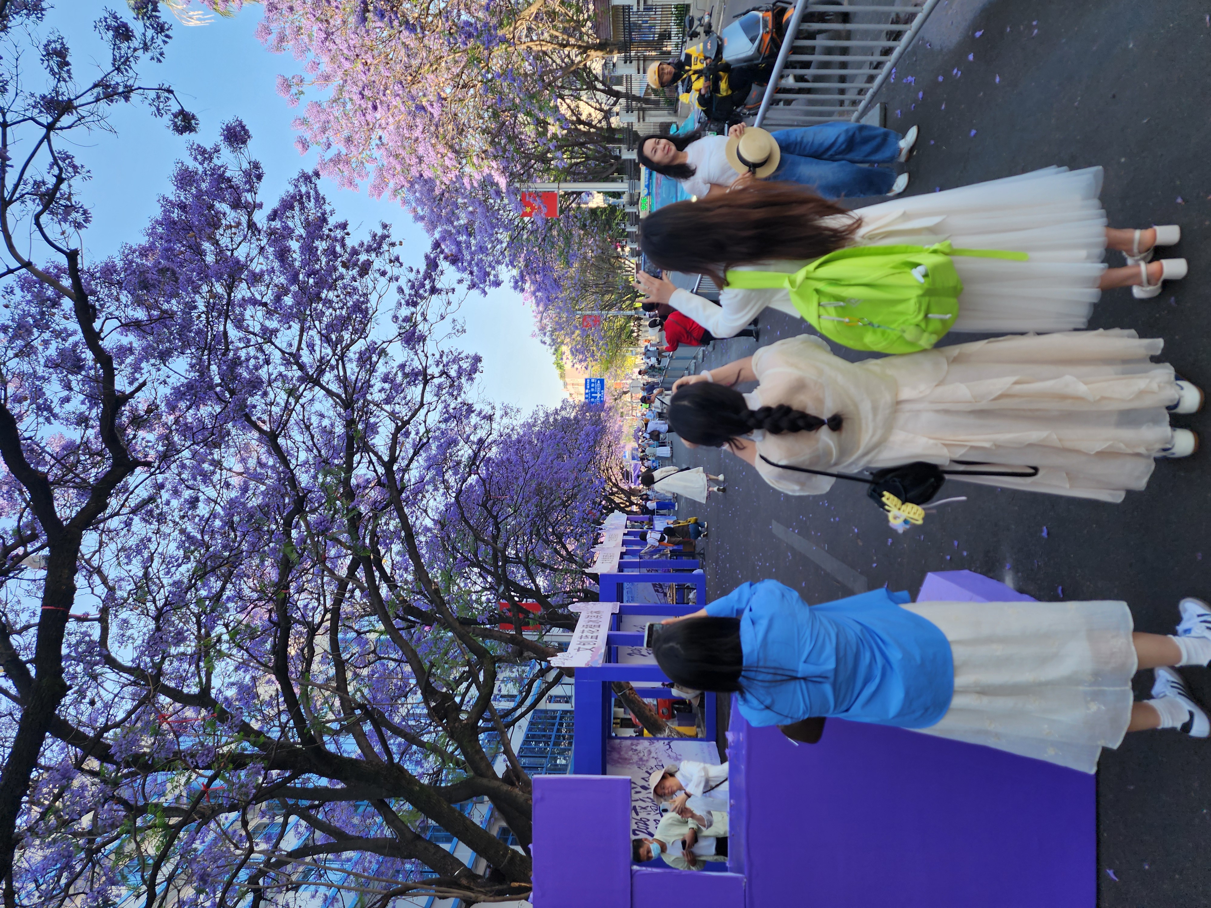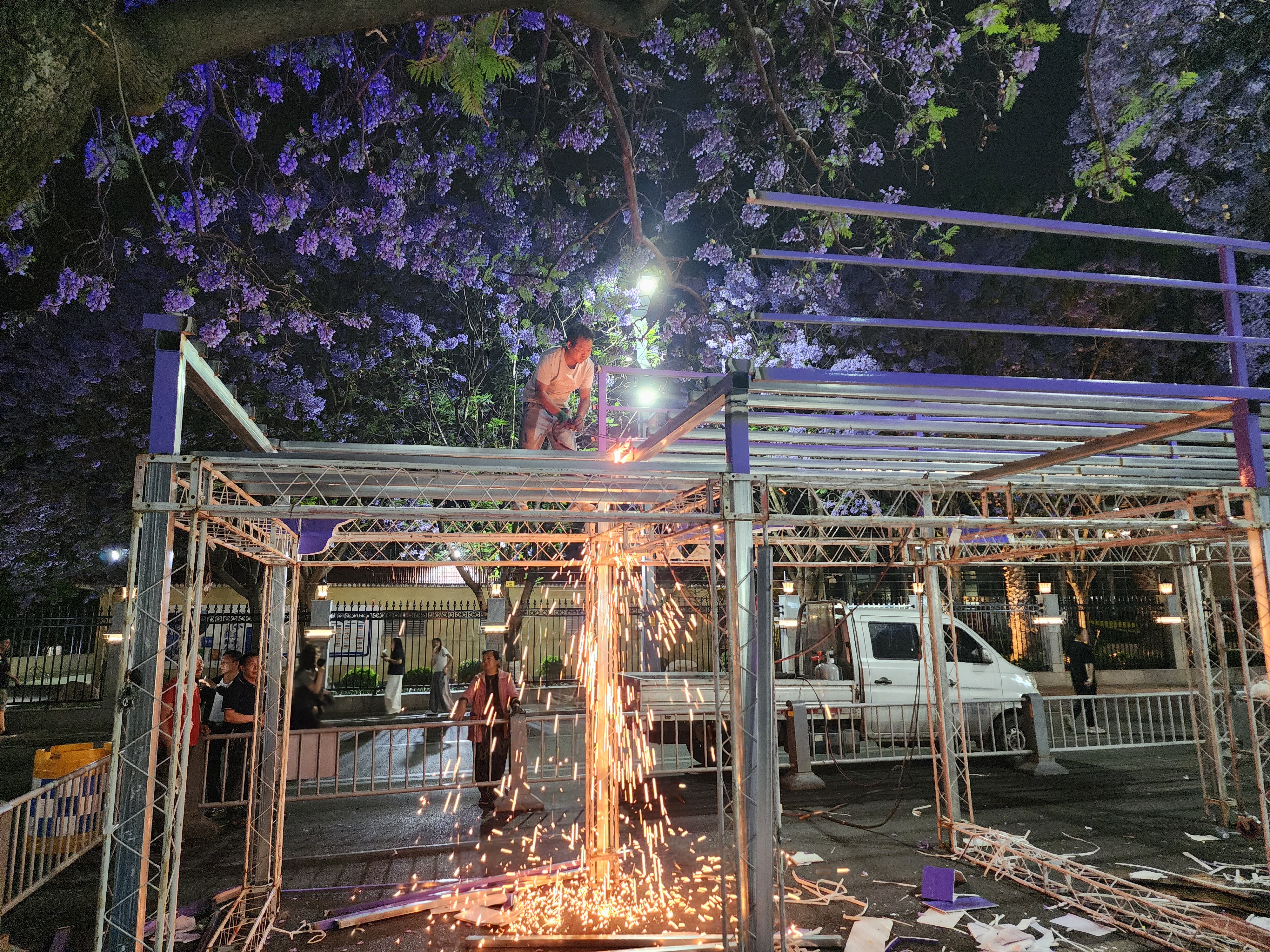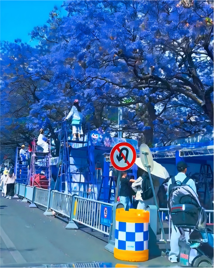 然而,有多名网友发视频称,航天北路“没法赏花”了:近几天,这条路上观赏蓝花楹的最佳位置,都被临时搭建的摊位和高高的梯子挡了,“最佳位置都被搭架和文创集装箱挡完了,还怎么赏花?通过缝隙里观赏吗?”
