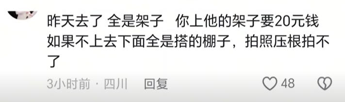 “上架子拍照,就要20元,如果不上架子,下面全是搭的棚子,拍照压根拍不了”“变成了菜市场,乱糟糟的”……不少网友在社交平台吐槽。