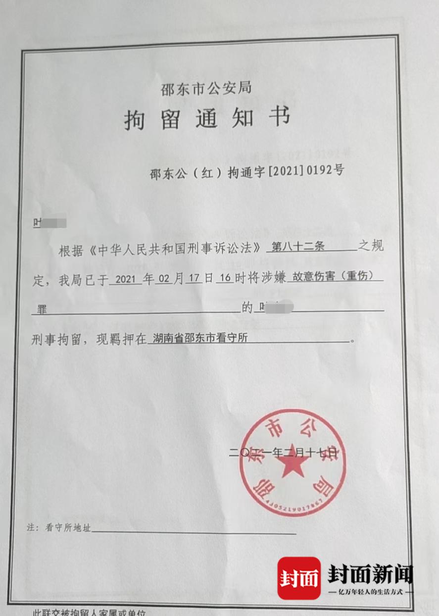 叶鹏报了警,医院工作人员也报了警。随后,民警在一间游戏厅找到叶飞,并将其带走。拘留通知书显示,2021年2月17日,叶飞因故意伤害(重伤)罪被刑事拘留,羁押于邵东市看守所。