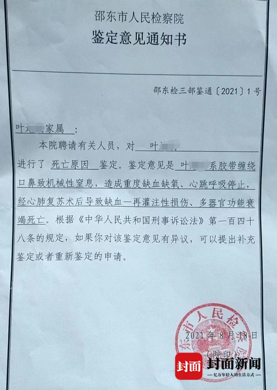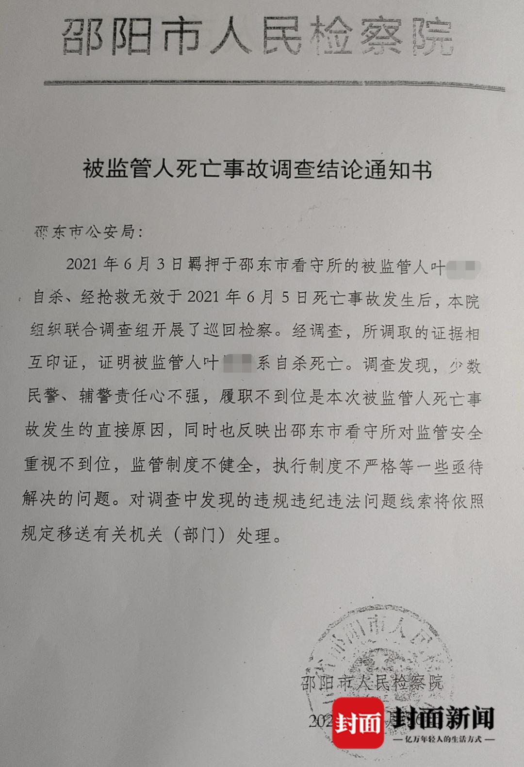 2021年8月,邵阳市人民检察院分别向叶鹏和邵东市公安局送达《被监管人员死亡事故调查结论通知书》(简称《通知书》)。