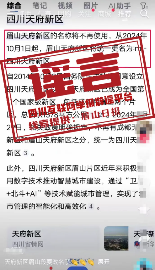 近期,有网友根据眉山天府新区成眉交界处“眉山天府新区”立柱进行施工围挡情况,发布视频称眉山天府新区名称将不再使用,佐以百度AI搜索引发群众对于区域发展的炒作。经眉山天府新区网信办核实,系谣言。目前,相关视频已删除,并在围挡处用显眼字体和公告进行澄清。(来源:眉山日报)