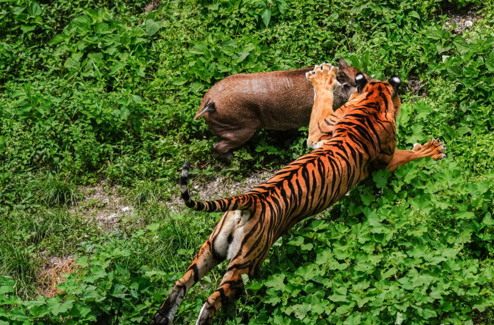 福建梅花山“中国虎园”中正在捕猎的华南虎。(刘艳晖 摄)