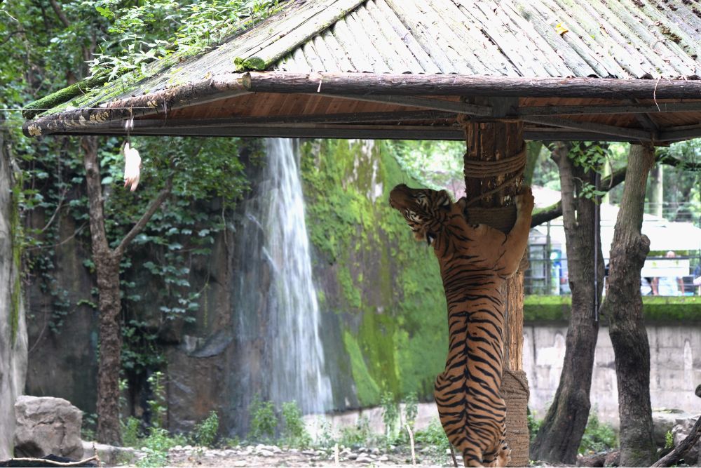 工作人员介绍,目前上海动物园狮虎山生活着三种老虎:东北虎、华南虎、孟加拉虎。作为华南虎的重要繁育基地之一,动物园对这里的20余头华南虎“建档立卡”、报“户口”、上“家谱”,科学施策、精心饲喂,同时建立华南虎基因库,开展基因保护研究。