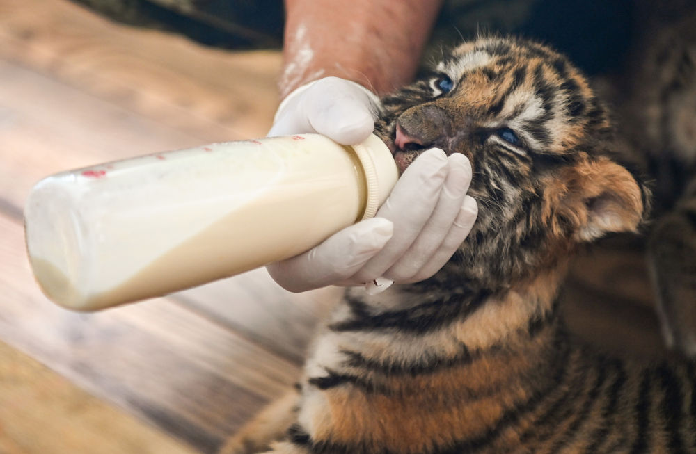 饲养员李鑫一会儿测量小老虎的体温,一会儿给它们喂奶,密切观测着“虎娃”们的动态,“为了保证小虎健康成长,我们每天都要严格消毒。如果有‘虎妈’奶水不足,会及时对小虎进行人工饲喂。”
