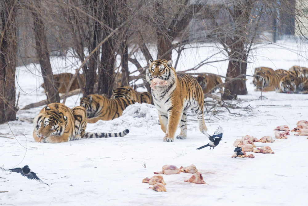 “为了不让老虎饭来张口,我们想了很多办法,滑轮送饭是其中一种。老虎在野外的时候,并不是每天都能吃上饭,为了保持它们对食物的欲望和野性,我们每周还给老虎‘辟谷’,让它们断食一天。”饲养员徐彪说,“你看,这两只刚刚‘辟谷’后的老虎,吃饭是不是特别香?”