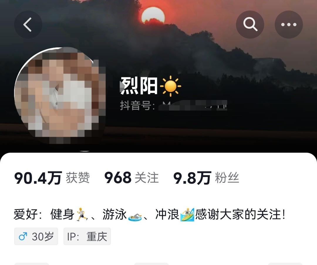 封面新闻查询发现,“烈阳”在某短视频平台拥有9.7万粉丝,年龄标注为30岁,主页备注个人爱好为健身、游泳、冲浪。