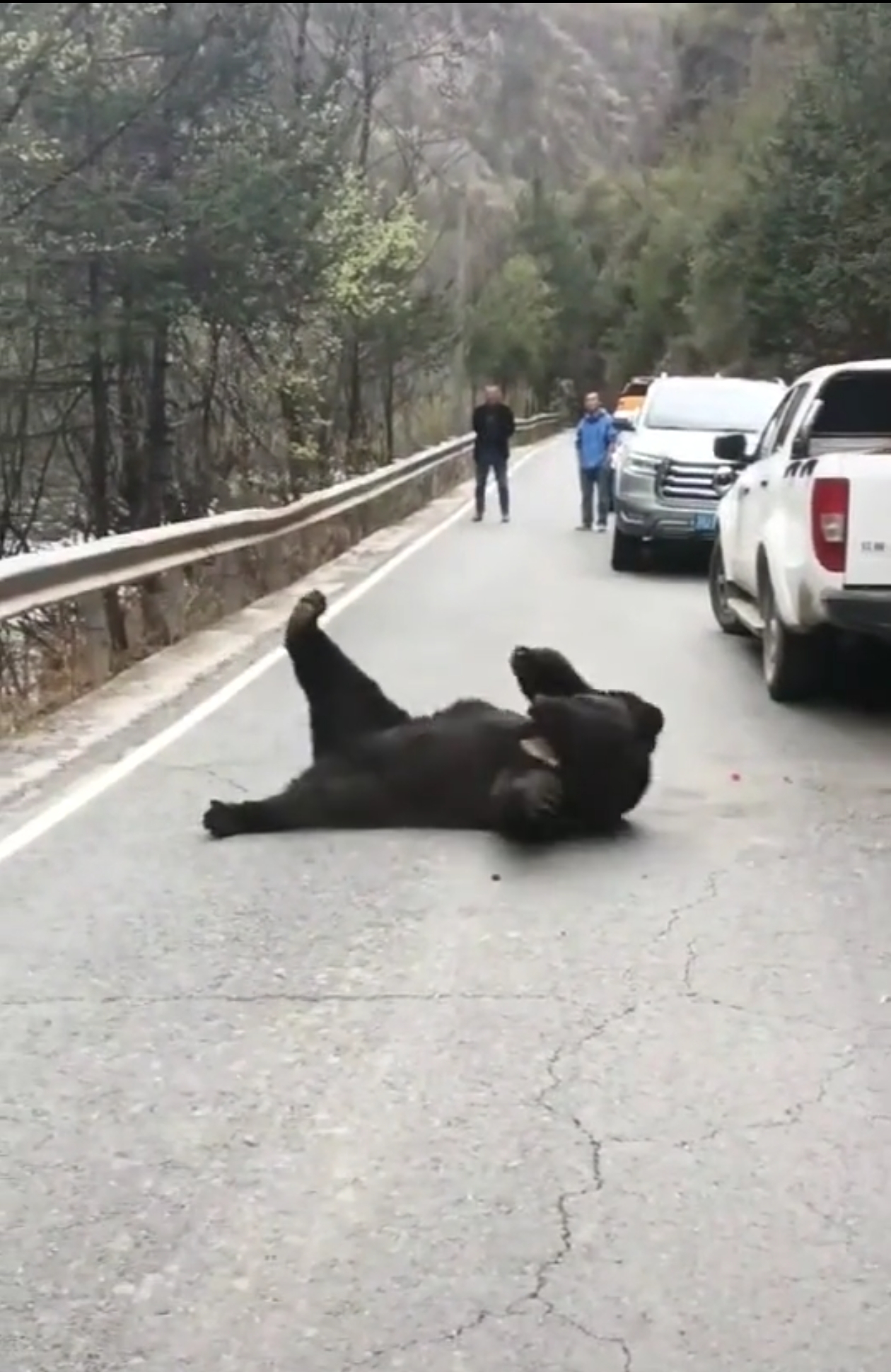 近日,有网友发布视频显示:一头胸前有一簇白色毛发的黑熊,在道路上翻滚,疑似受伤。道路上,还停着一排车辆,有人正围观。有网友怀疑,黑熊可能是被车撞伤,或是蛇咬伤。也有网友评论说,“确实没人敢扶”。