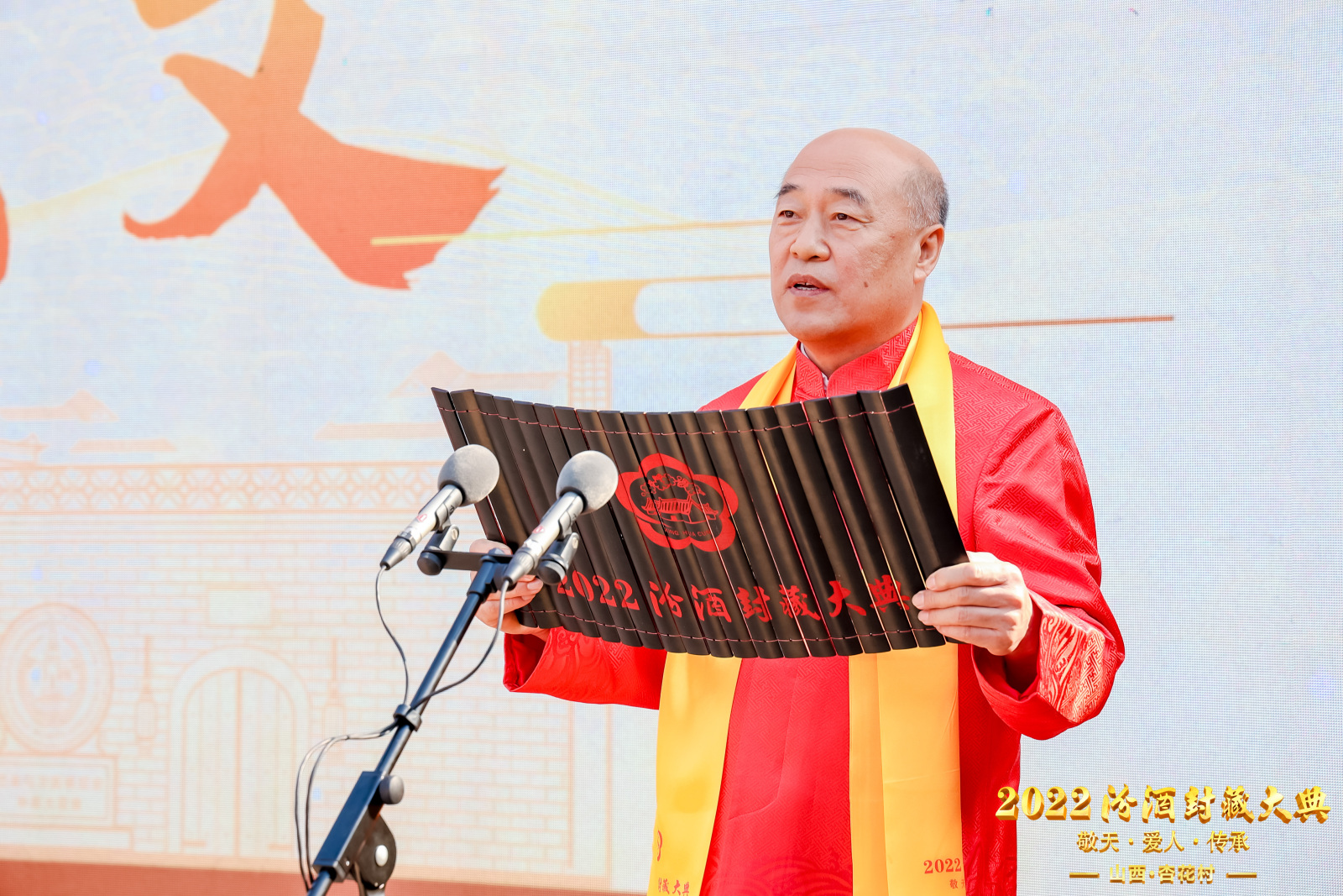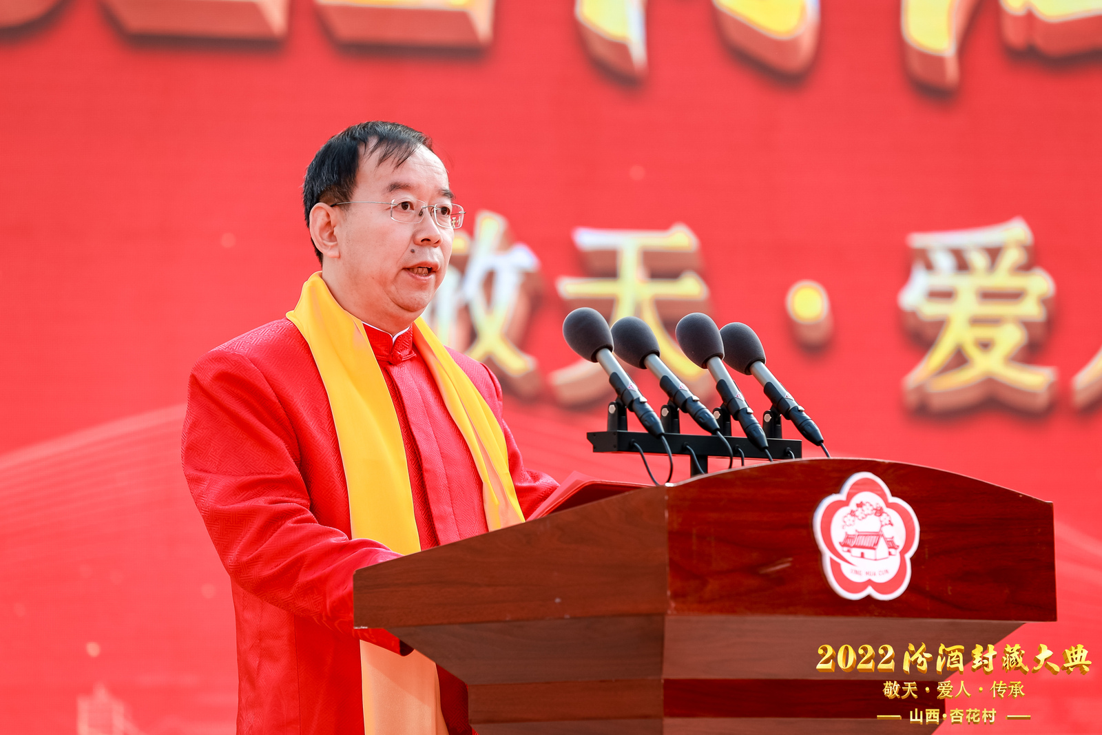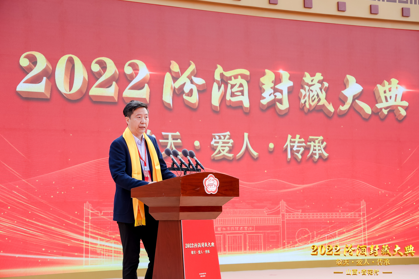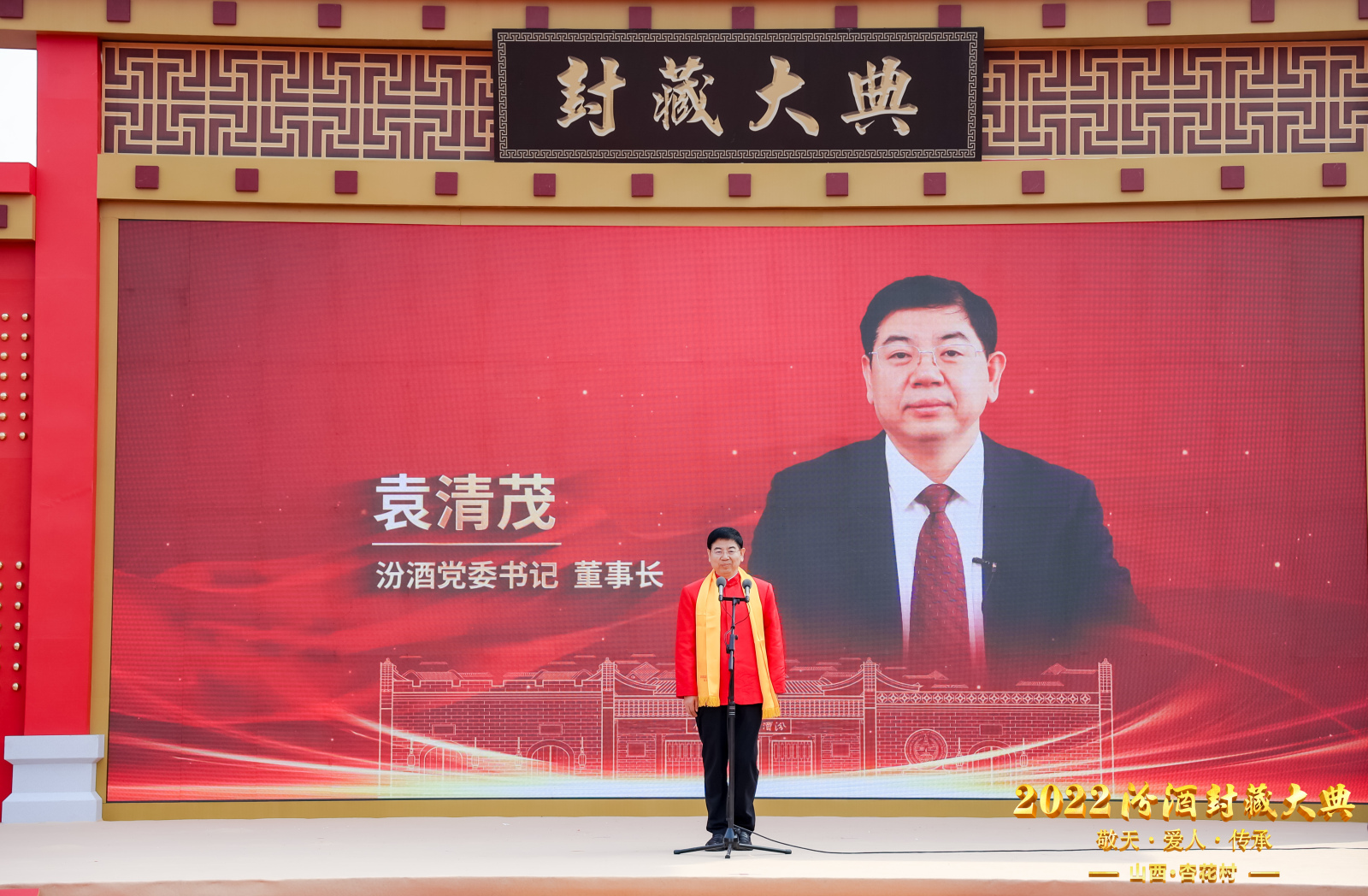 “匠心独蕴,竹酒澄芳。清流之品,得造花香。国运日隆,酒脉更昌。纲领既定,人心所向。活态铸魂,品质至上。内强管理,外拓市场。改革深化,积蓄力量。初心不忘,更显担当……”汾酒集团总经理谭忠豹诵读的祝文,将2022汾酒封藏大典推向了高潮。