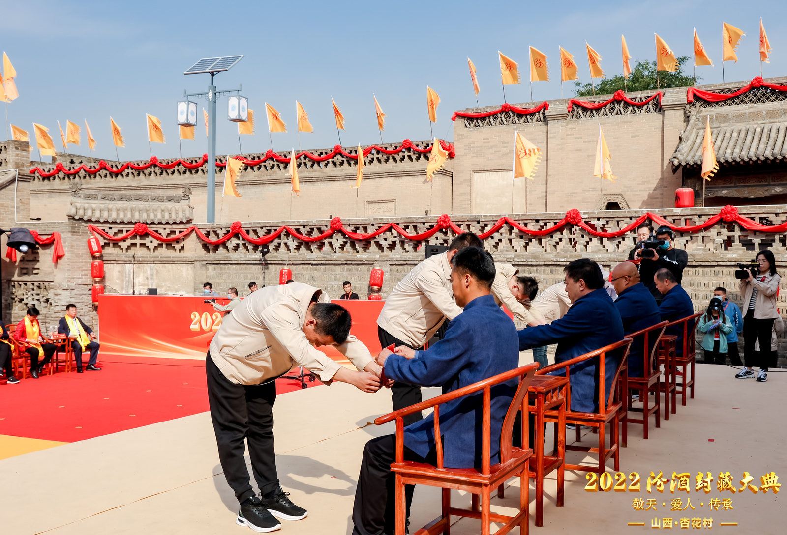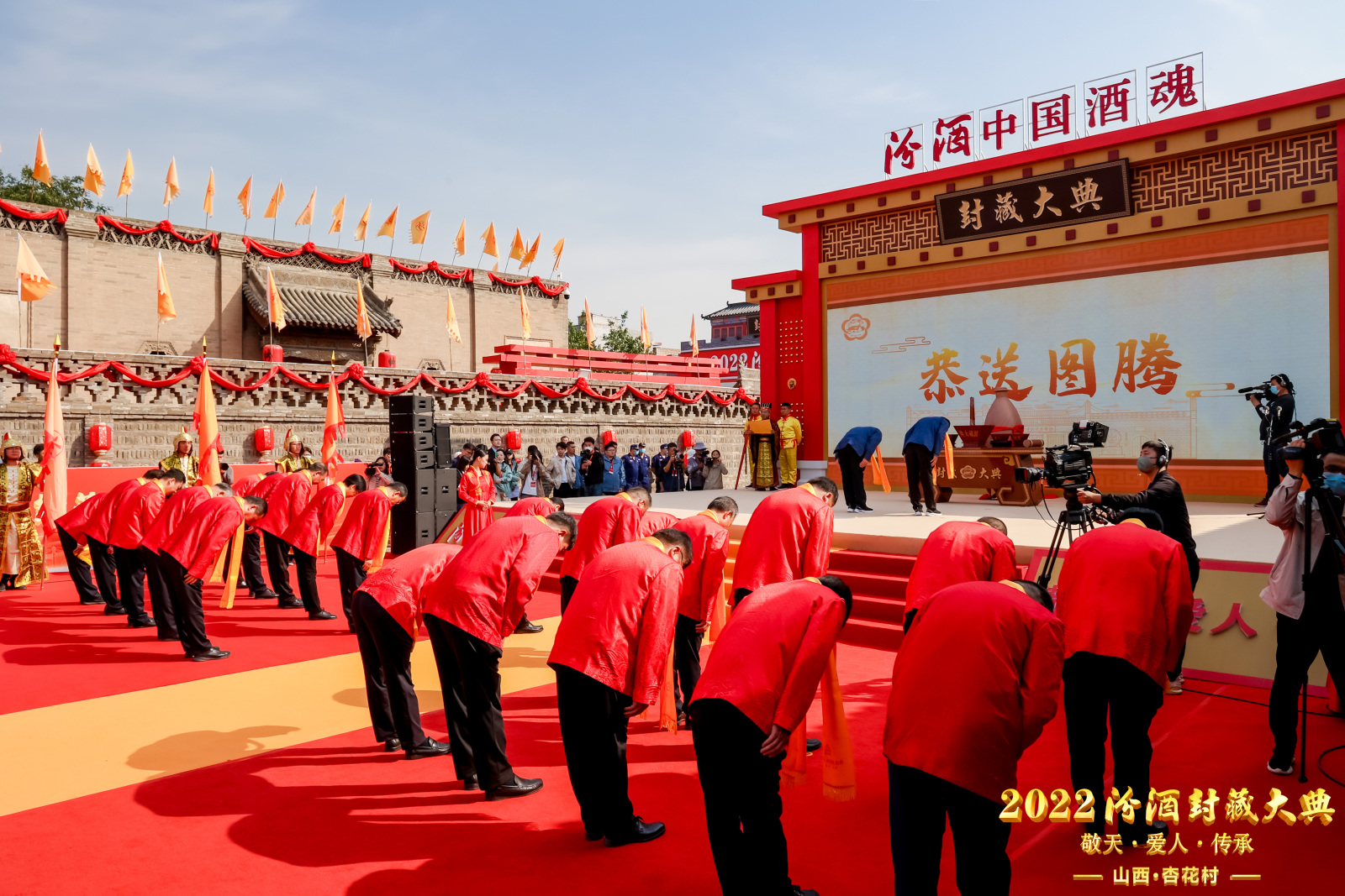 在庄严的古乐声中,汾酒众传承人以古老的礼仪礼敬先祖,彰显汾酒人磊落做人、以德敬天的心意。