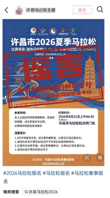 详情:近日,某平台账号发布关于“许昌市2026夏季马拉松”的赛事公告,引发关注。经河南省许昌市体育局核实,许昌市2026年度没有关于举办马拉松赛事的规划、申报及备案安排,确认该消息为不实信息。另据中国田径协会2025年12月19日公布的《2026年全国马拉松赛事目录》显示,河南省2026年计划举办5场马拉松赛事,均不在许昌市举办。(来源:“清朗河南”微信公众号、网信许昌)