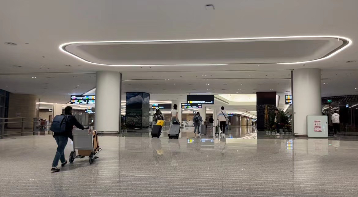 首批入境旅客到达成都天府国际机场后去搭乘公共交通