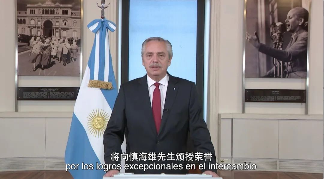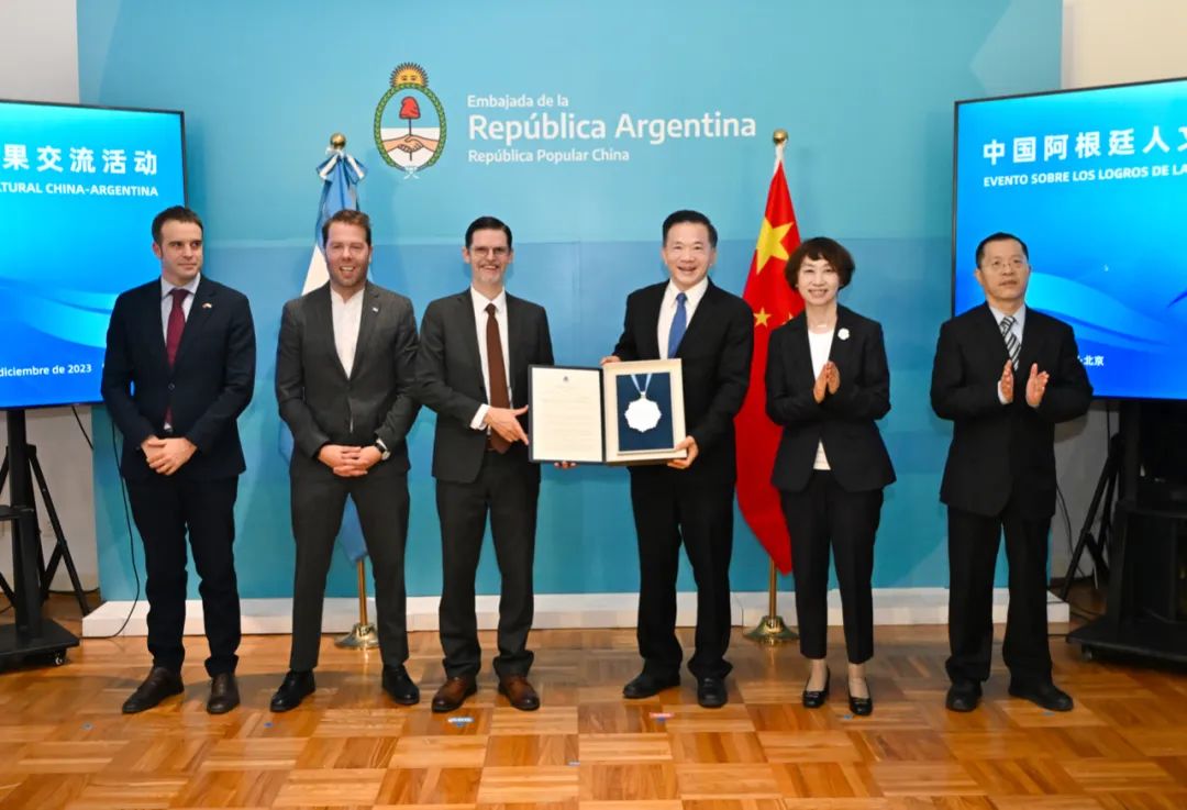 活动中,阿根廷政府授予了中宣部副部长、中央广播电视总台台长慎海雄“国际人文交流合作杰出成就奖”奖章。阿根廷驻华大使牛望道代表阿根廷总统阿尔韦托·费尔南德斯向获奖者颁奖。